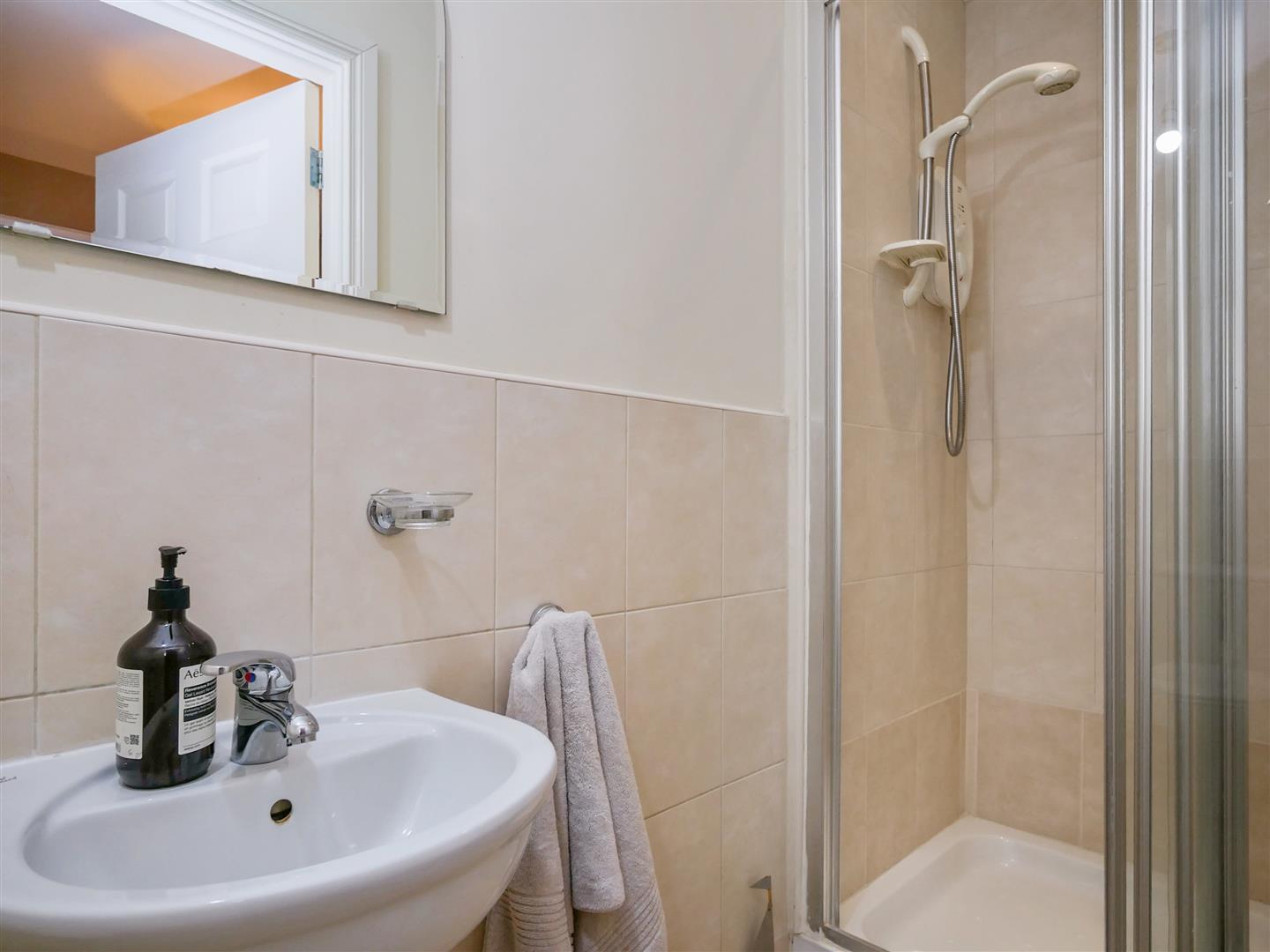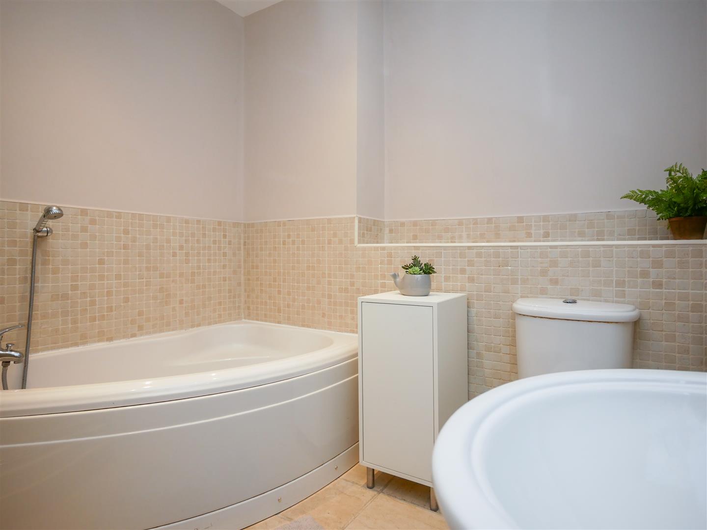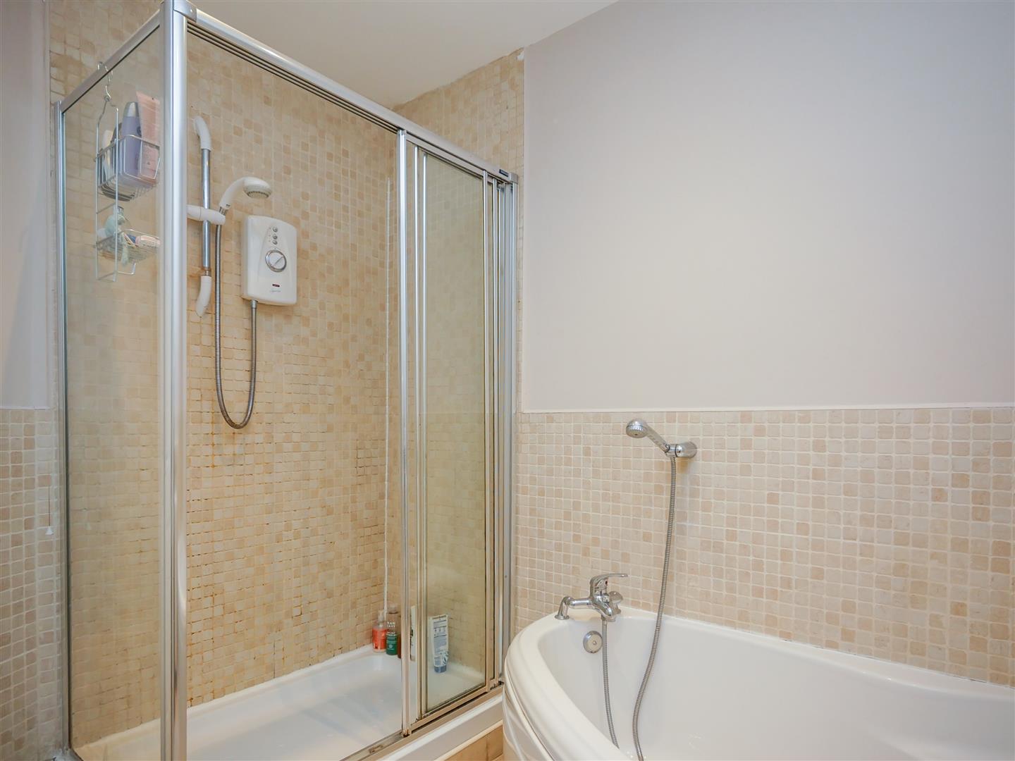Comprising panelled bath with mixer taps and hand shower, large walk in shower cubicle Aqualisa shower unit, wash hand basin with mixer taps, low flush w/c. Part tiled walls, tiled floor.