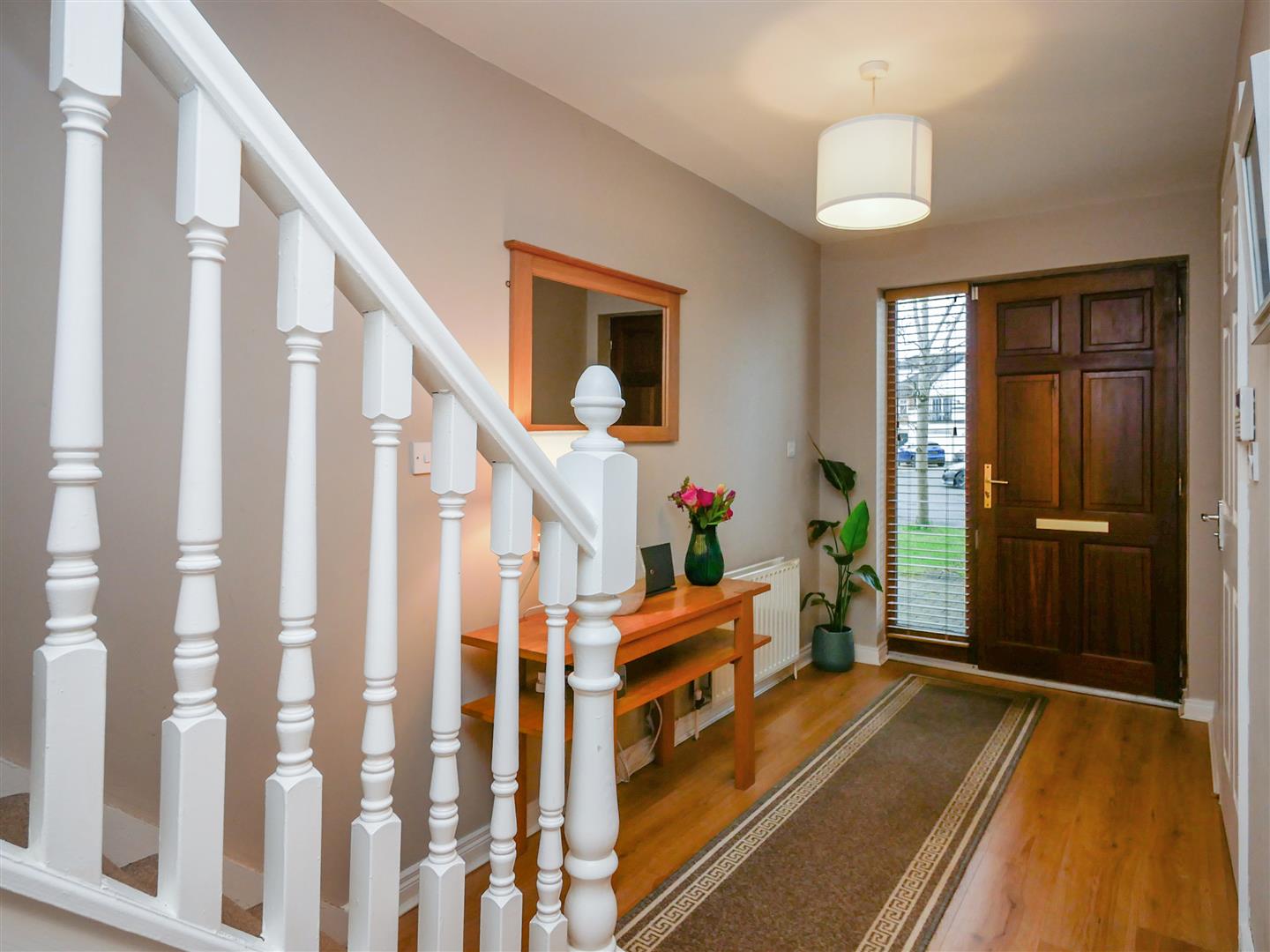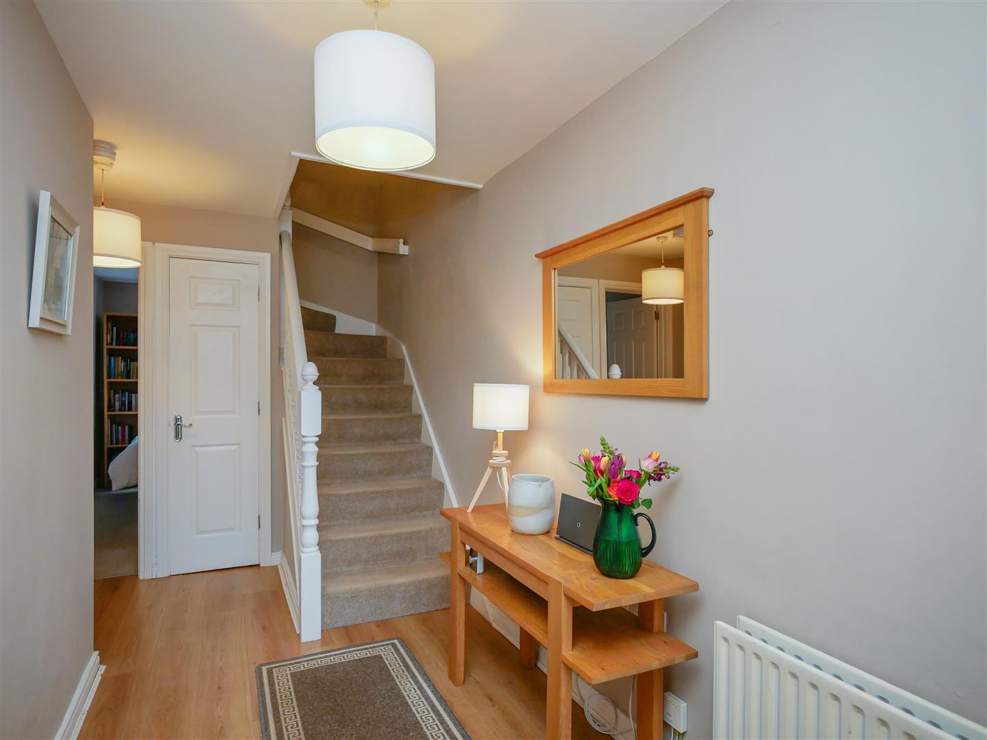 Hard wood front door with glazed side panel to entrance hall, laminate flooring.