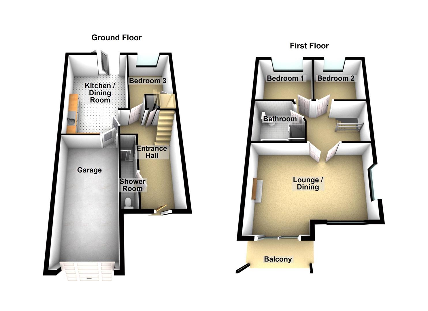Internally the property comprises kitchen / dining, bedroom three, shower suite and integral garage on the ground floor, while on the first floor there area a further two bedrooms, lounge dining with balcony over looking the communal green space and white bathroom suite with separate shower cubicle.