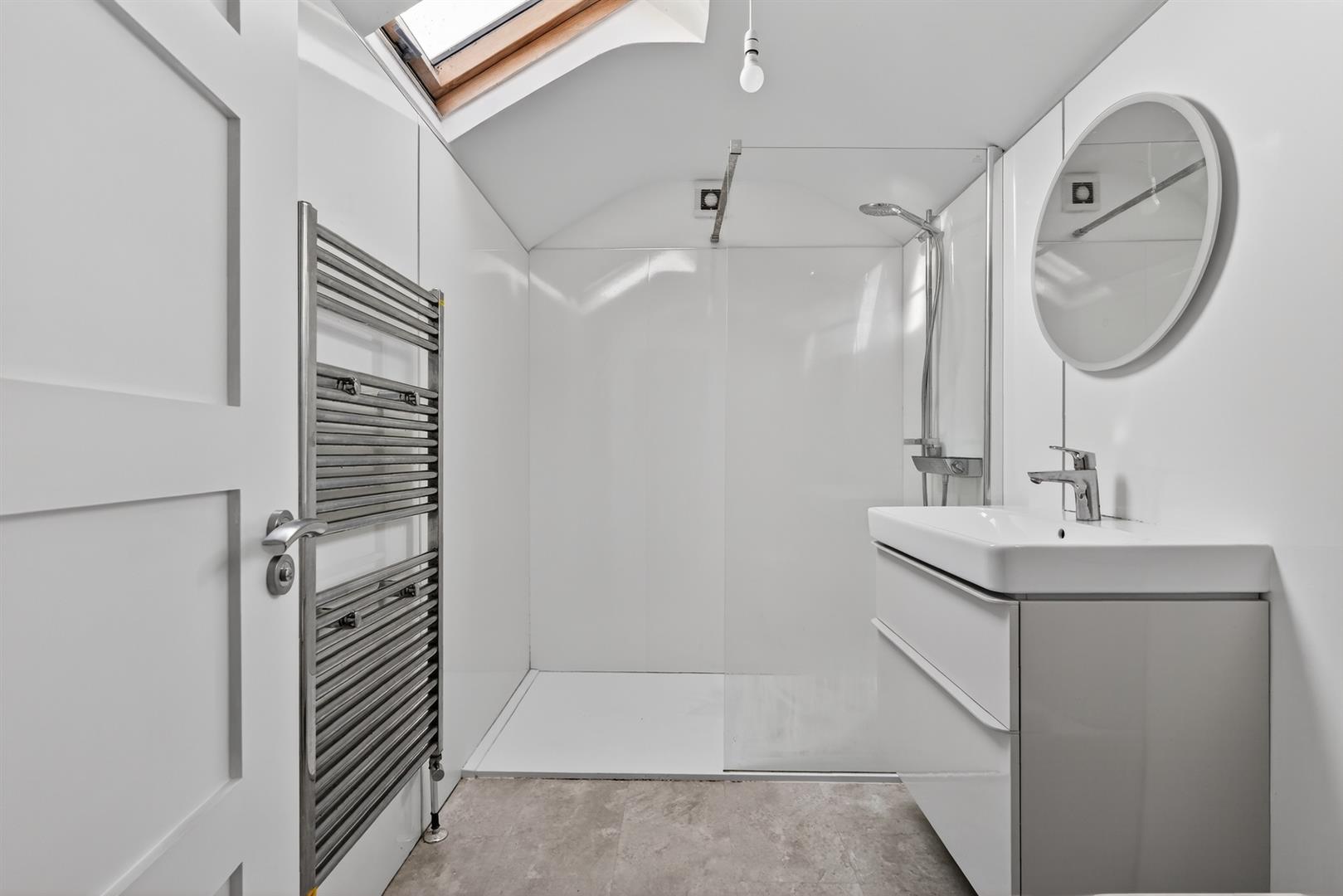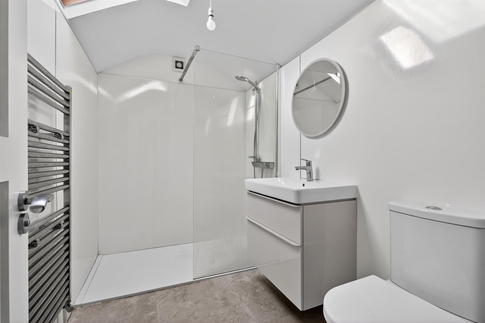 White suite with large walk in shower enclosure, wash hand basin with vanity unit below, low flush W.C wall mounted radiator, Velux window.