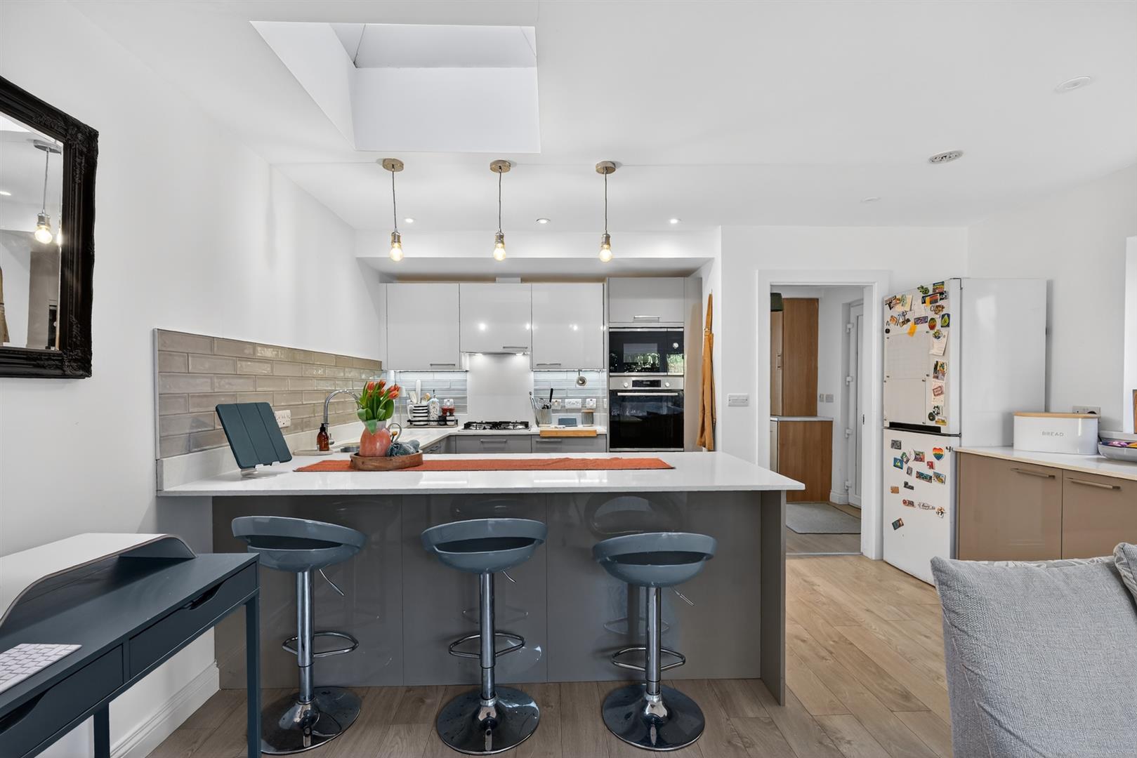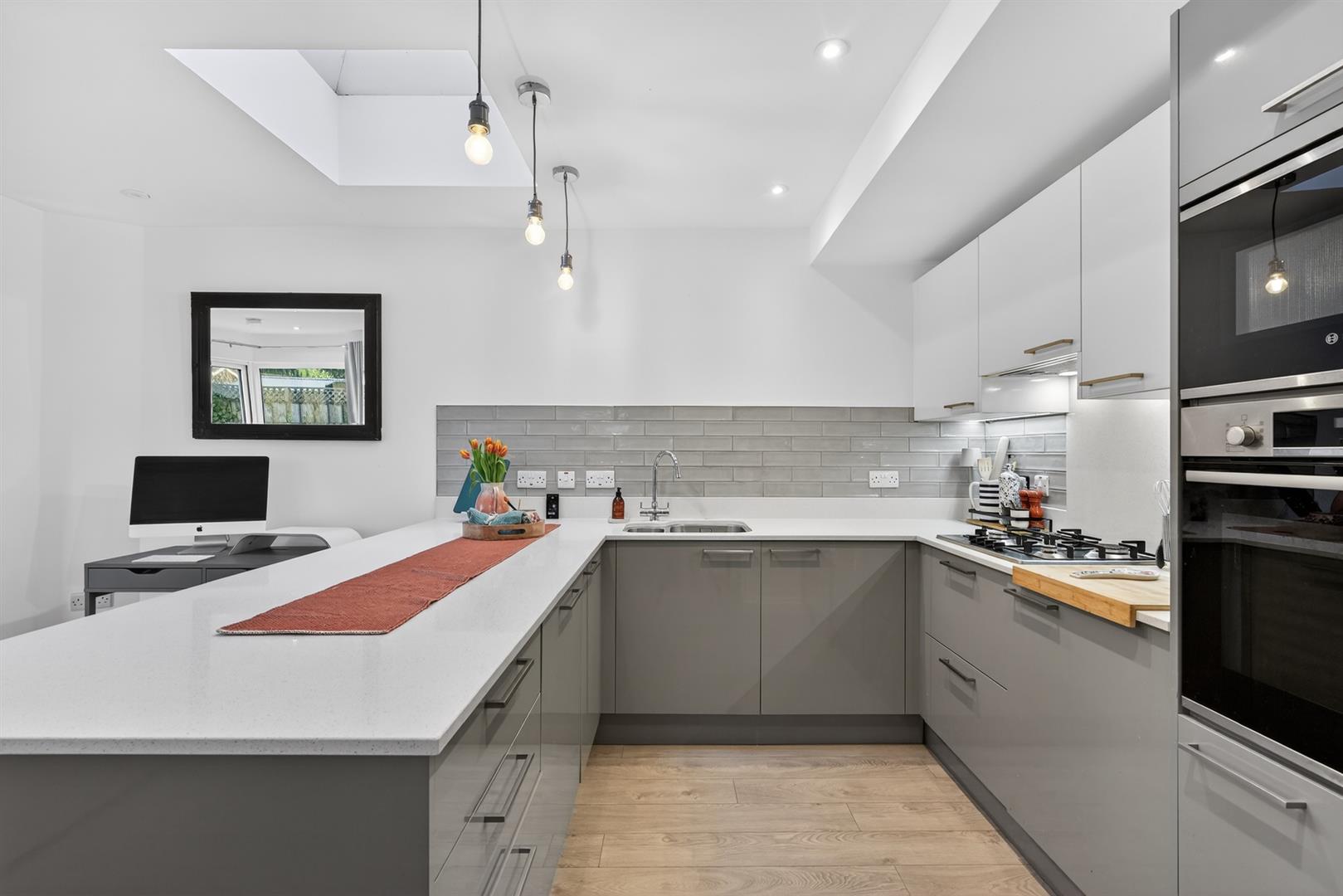 Contemporary range of high and low level units, wall mounted double oven, gas hob, extractor fan, granite work surfaces, breakfast bar, part tiled walls, recessed lighting. Bi folding doors to rear garden.