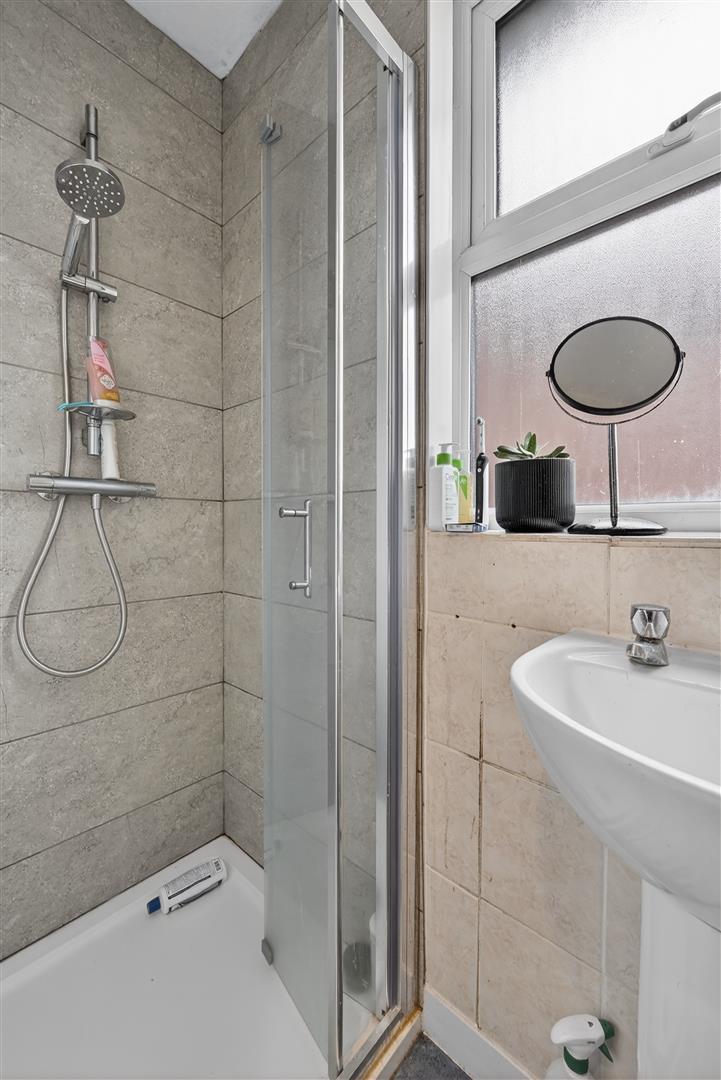 White suite comprising low flush w.c, pedestal wash hand basin, thermostatic shower and tiled walls.