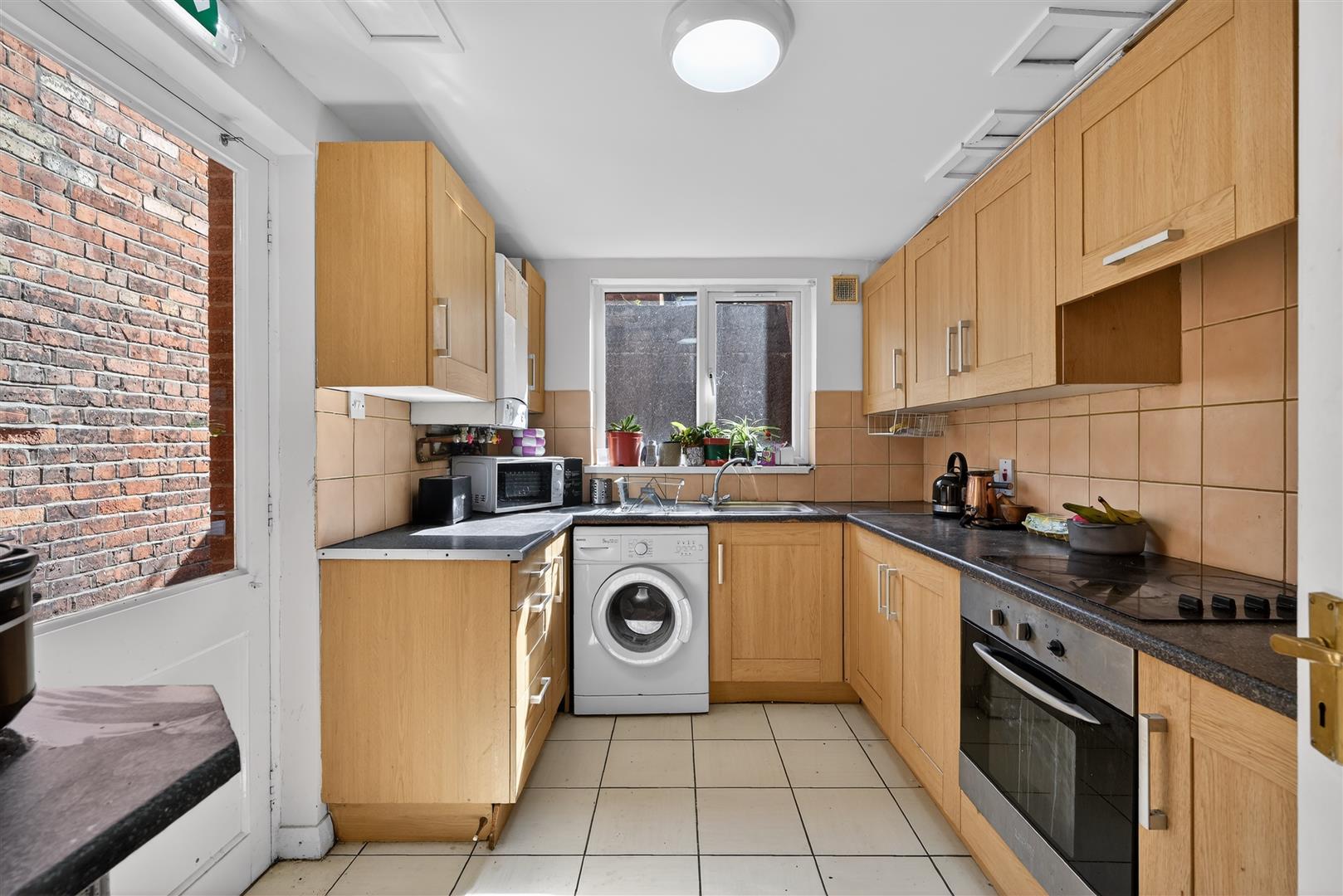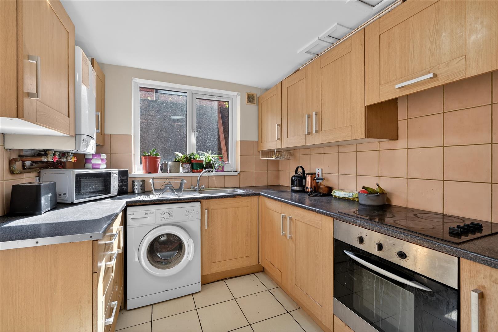 Modern range of high and low level units, plumbed for washing machine, built in oven with 4 ring electric hob, extractor fan, stainless steel sink unit with mixer tap, part tiled walls and tiled flooring.