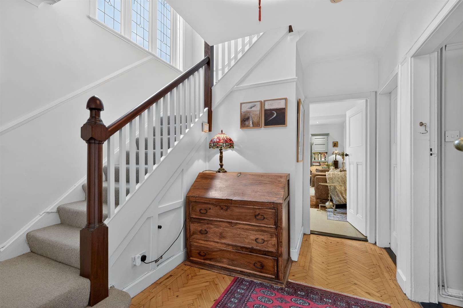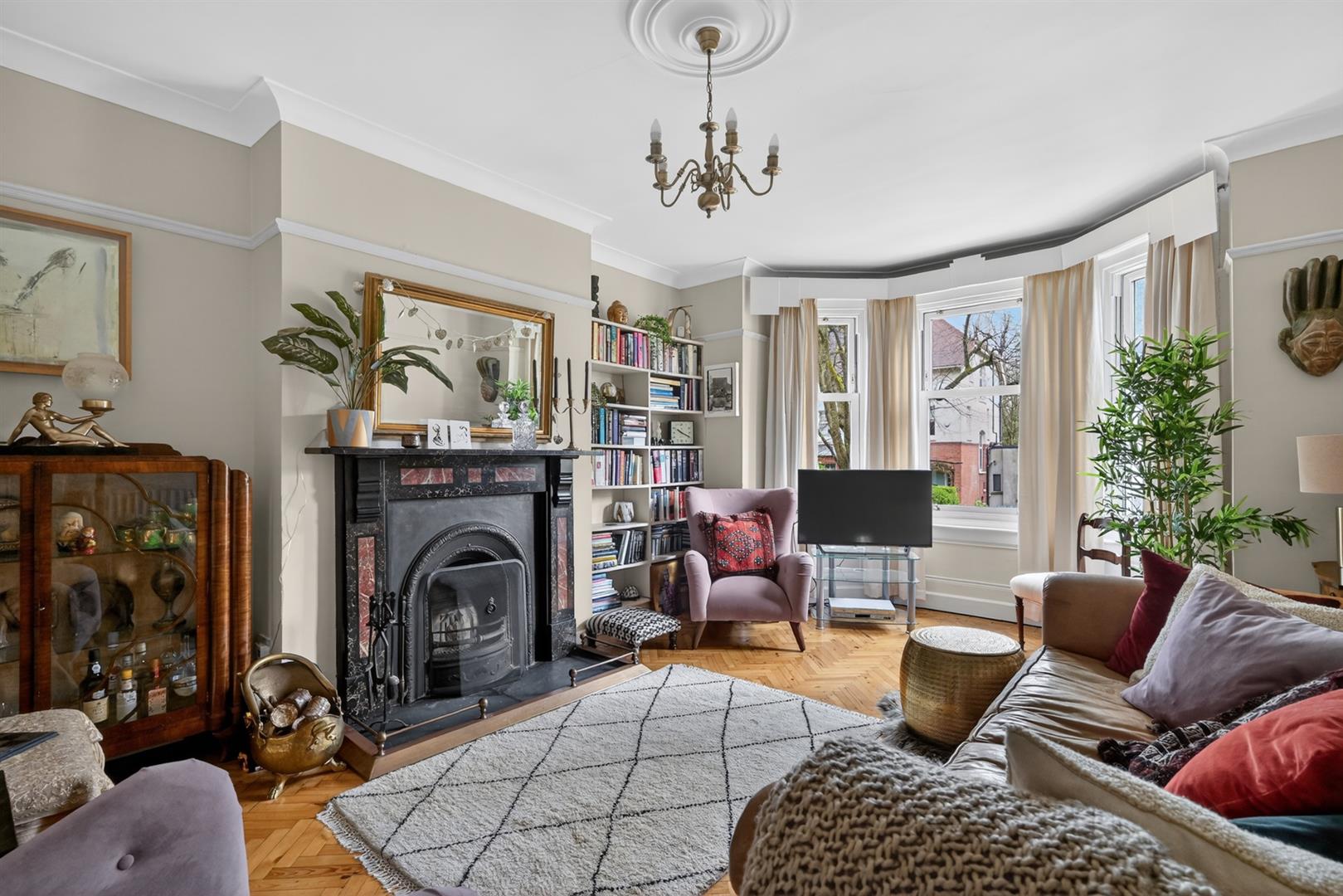 Solid wood herringbone floor, open fire, bay window, picture rail, cornicing, ceiling rose.
