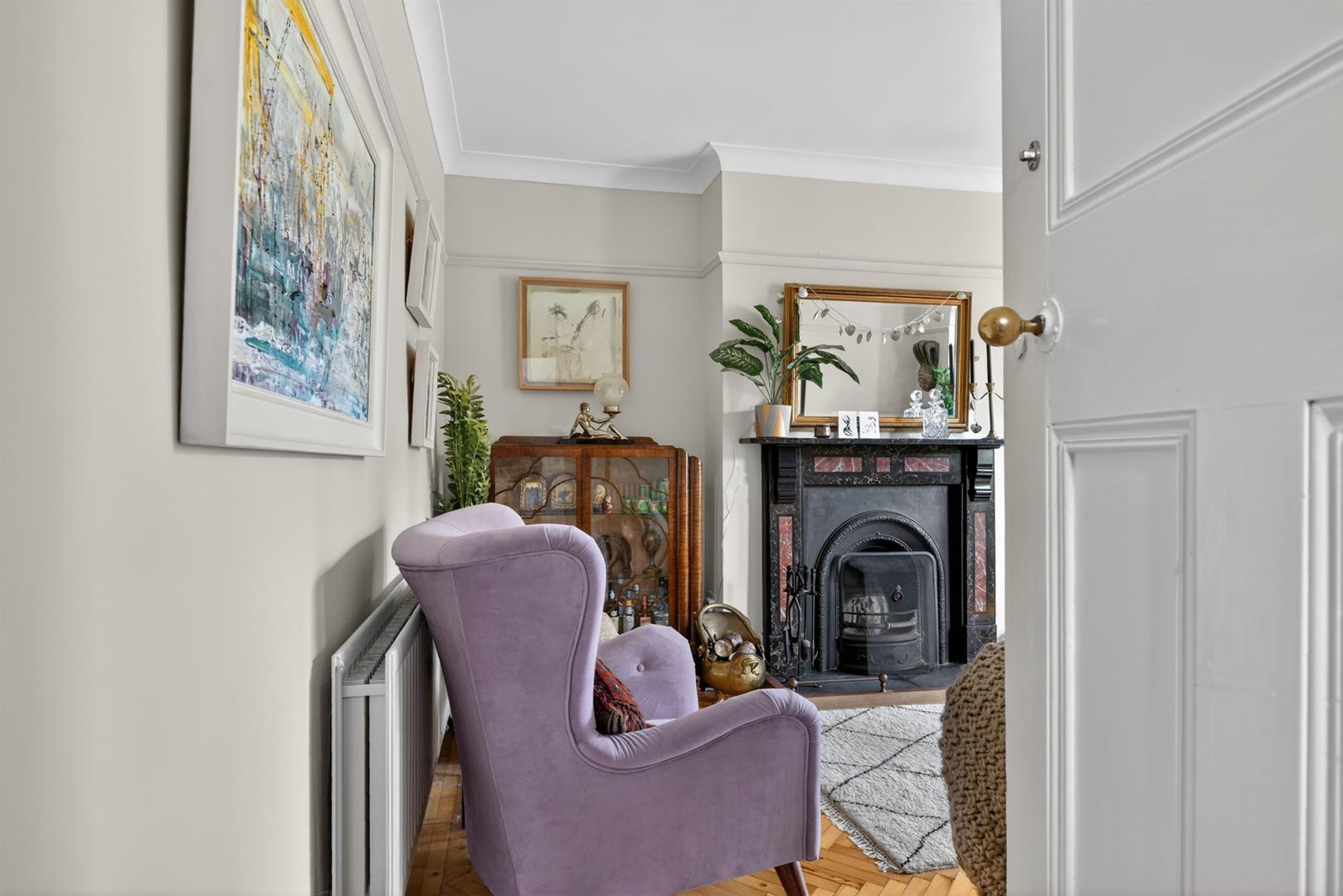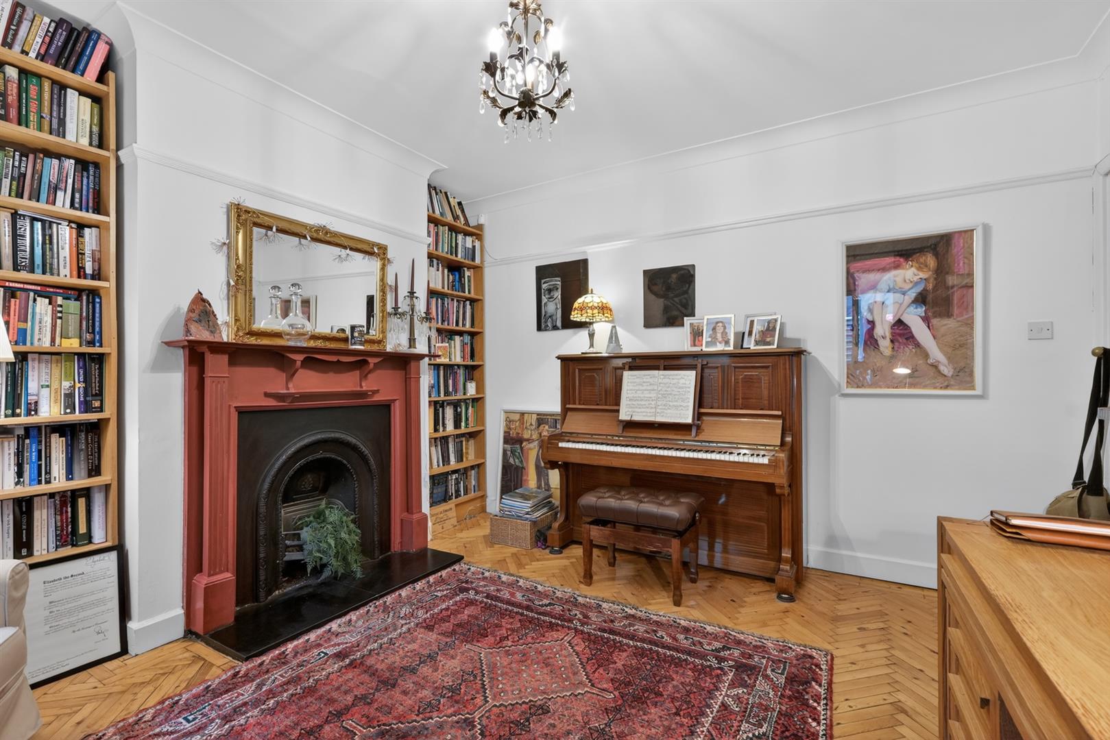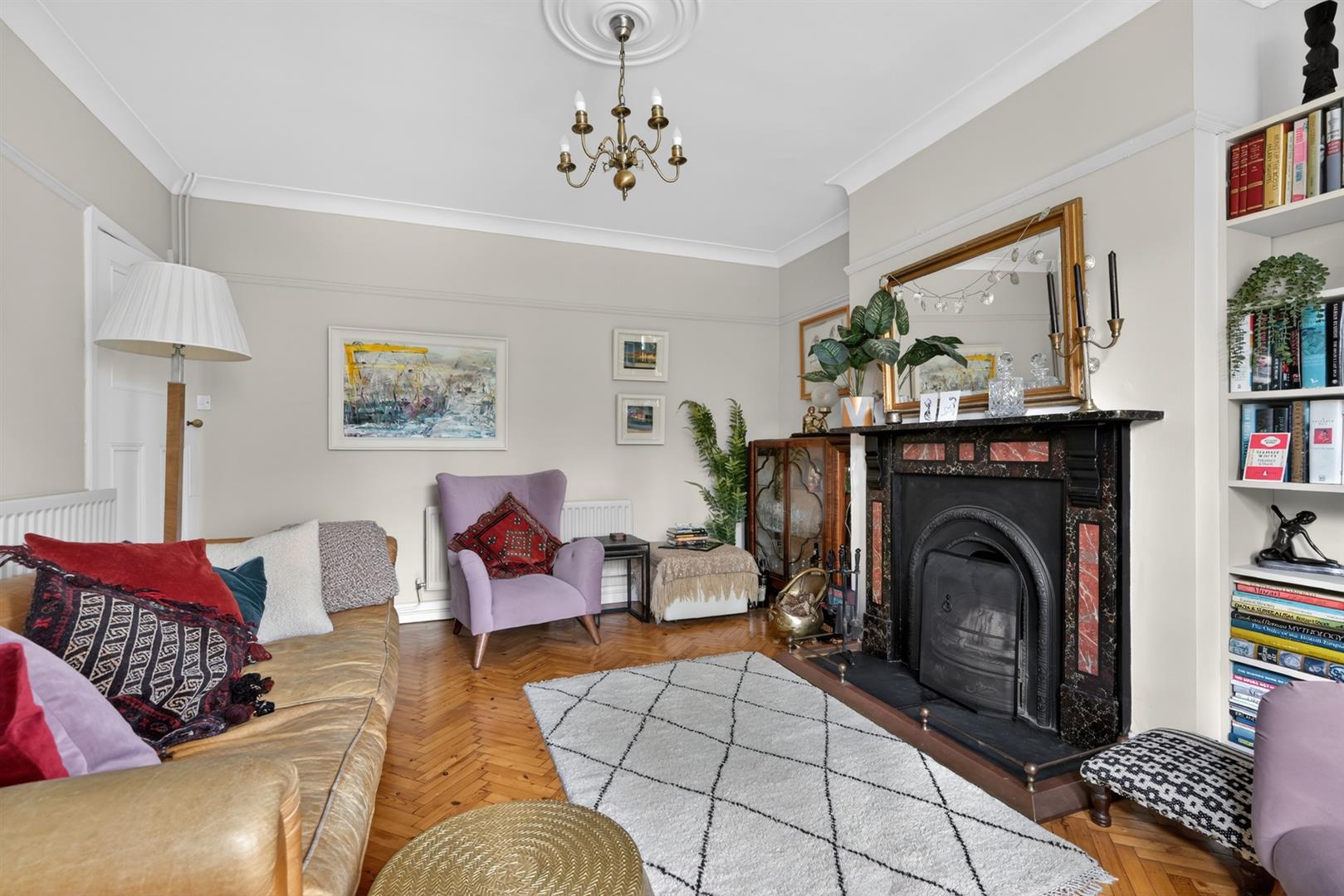 Solid wood herringbone flooring, open fire, picture rail, cornicing, ceiling rose.
