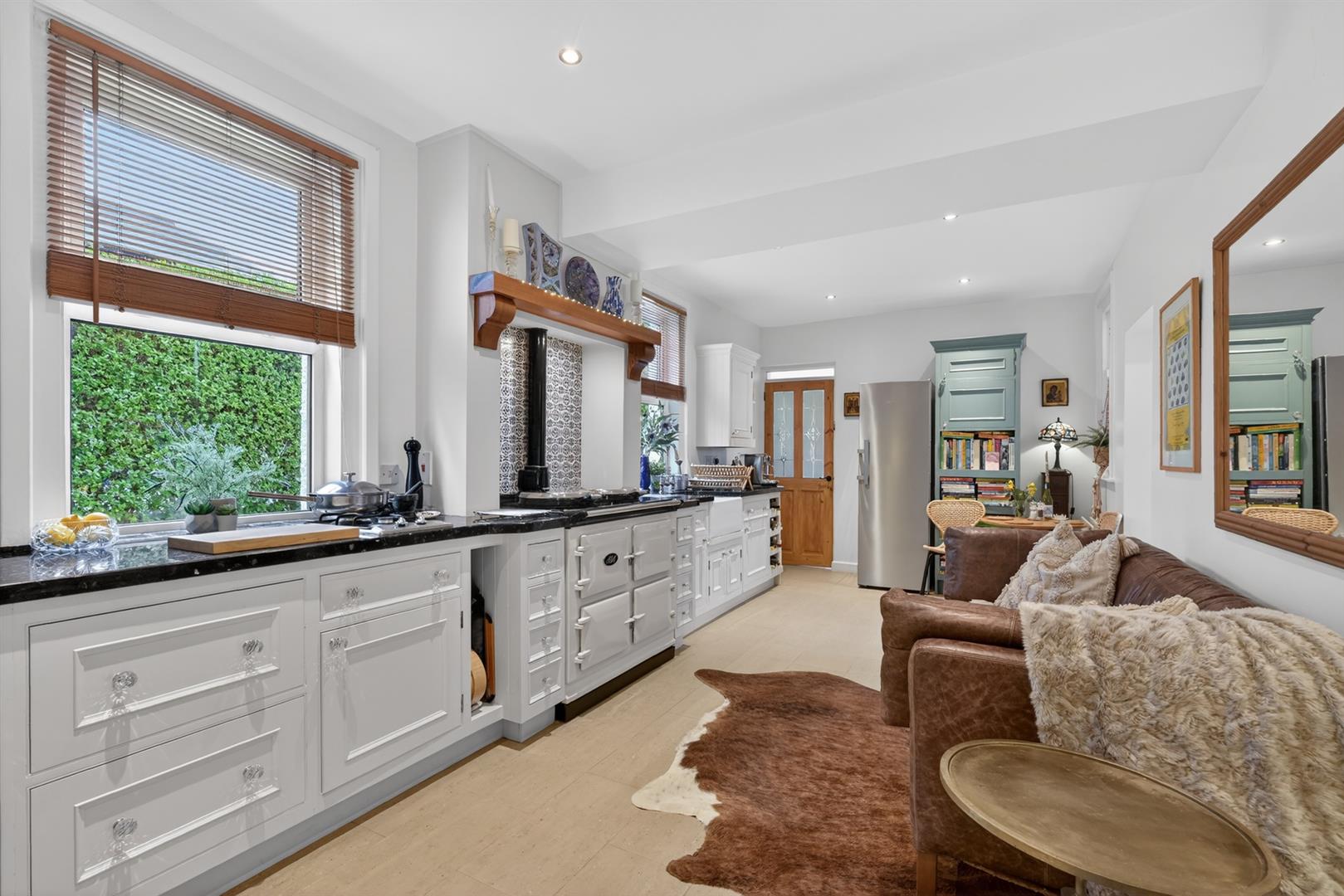 Range of high and low level units, Gas Aga with electric hot plates, 2 ring gas hob, Belfast sink with mixer tap, integrated dishwasher, granite work surfaces, tiled flooring.