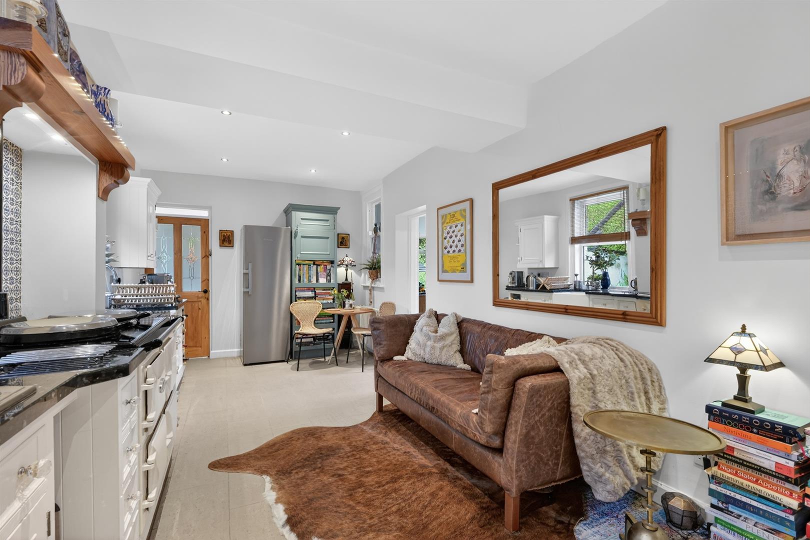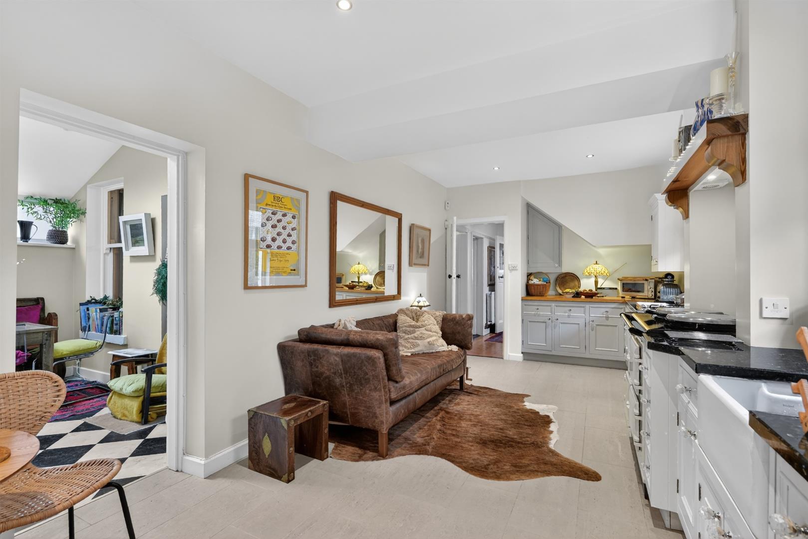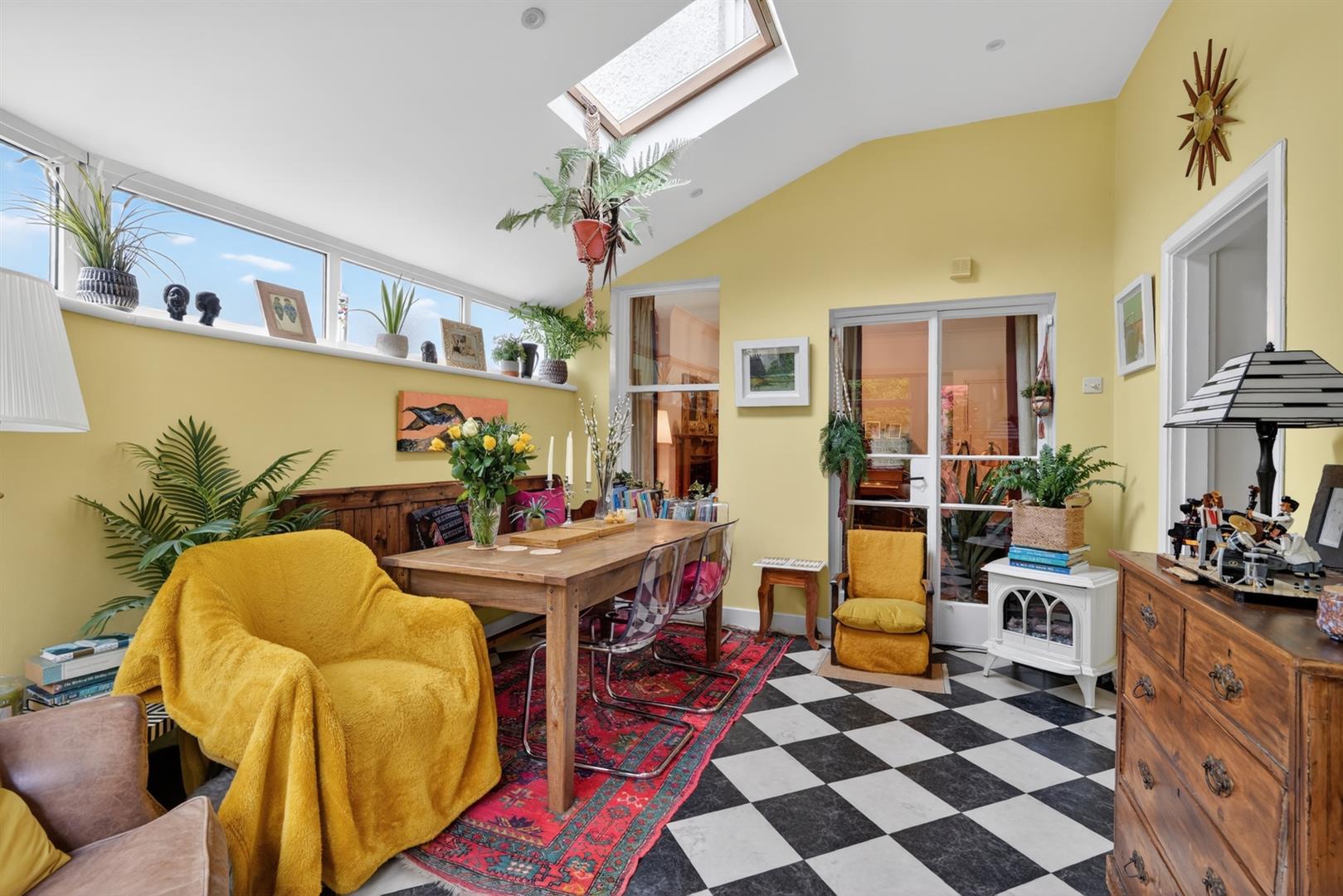 Tiled flooring, Velux, recessed spot lighting. Double doors to garden.