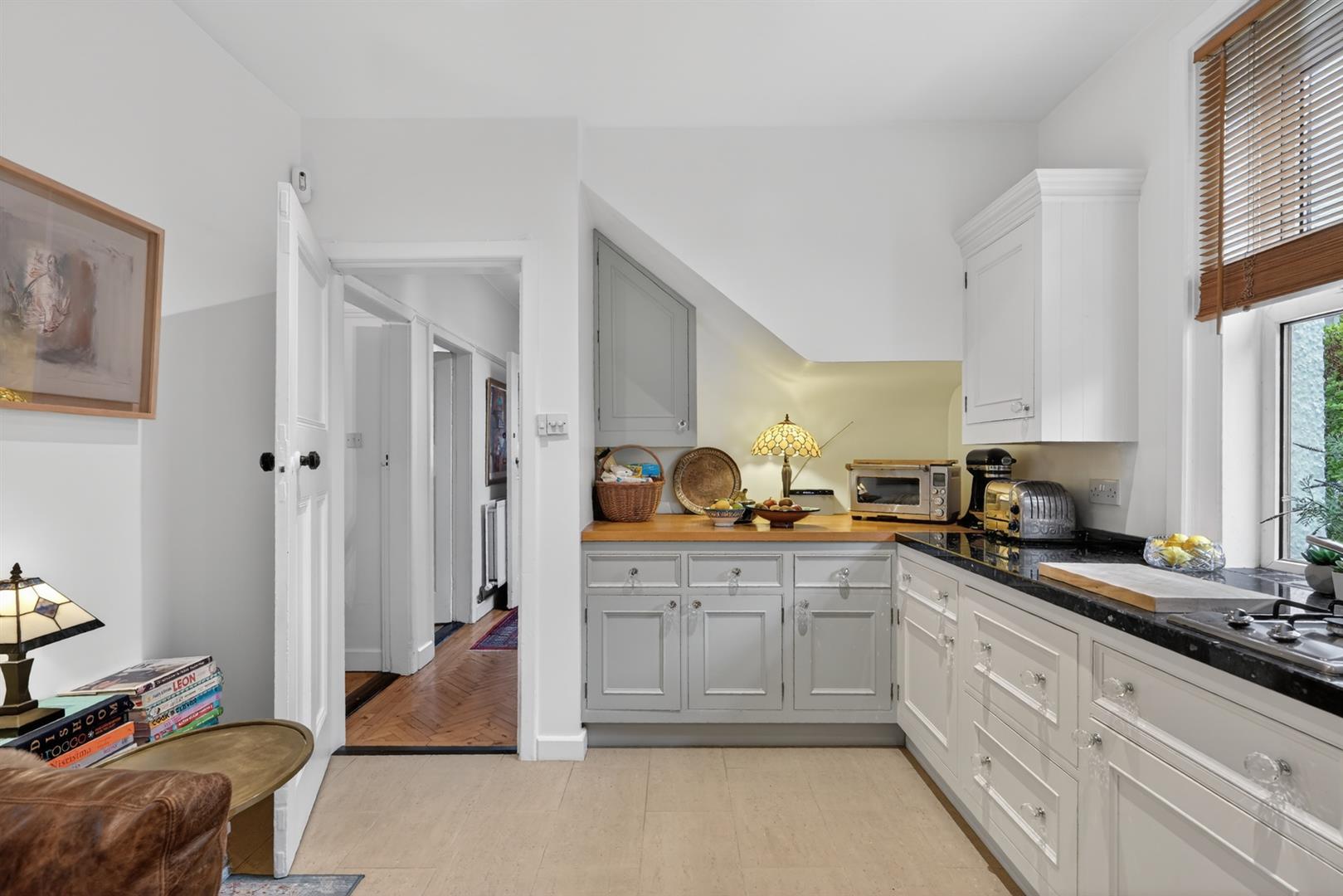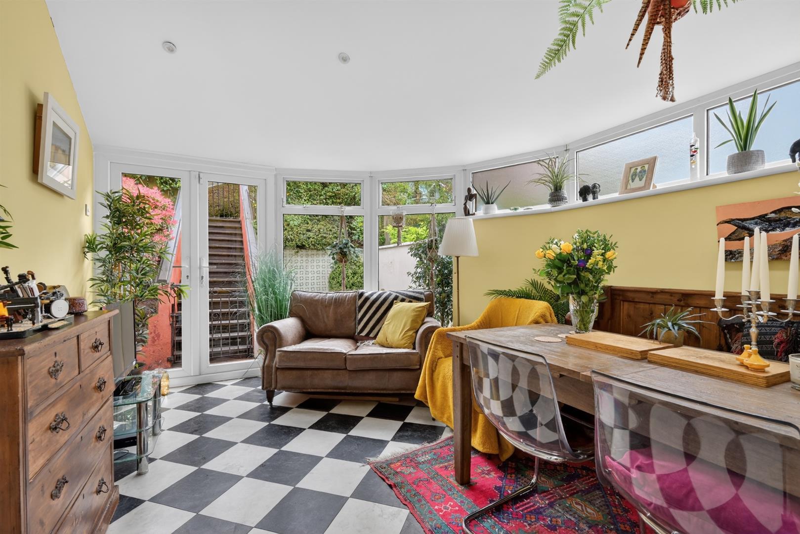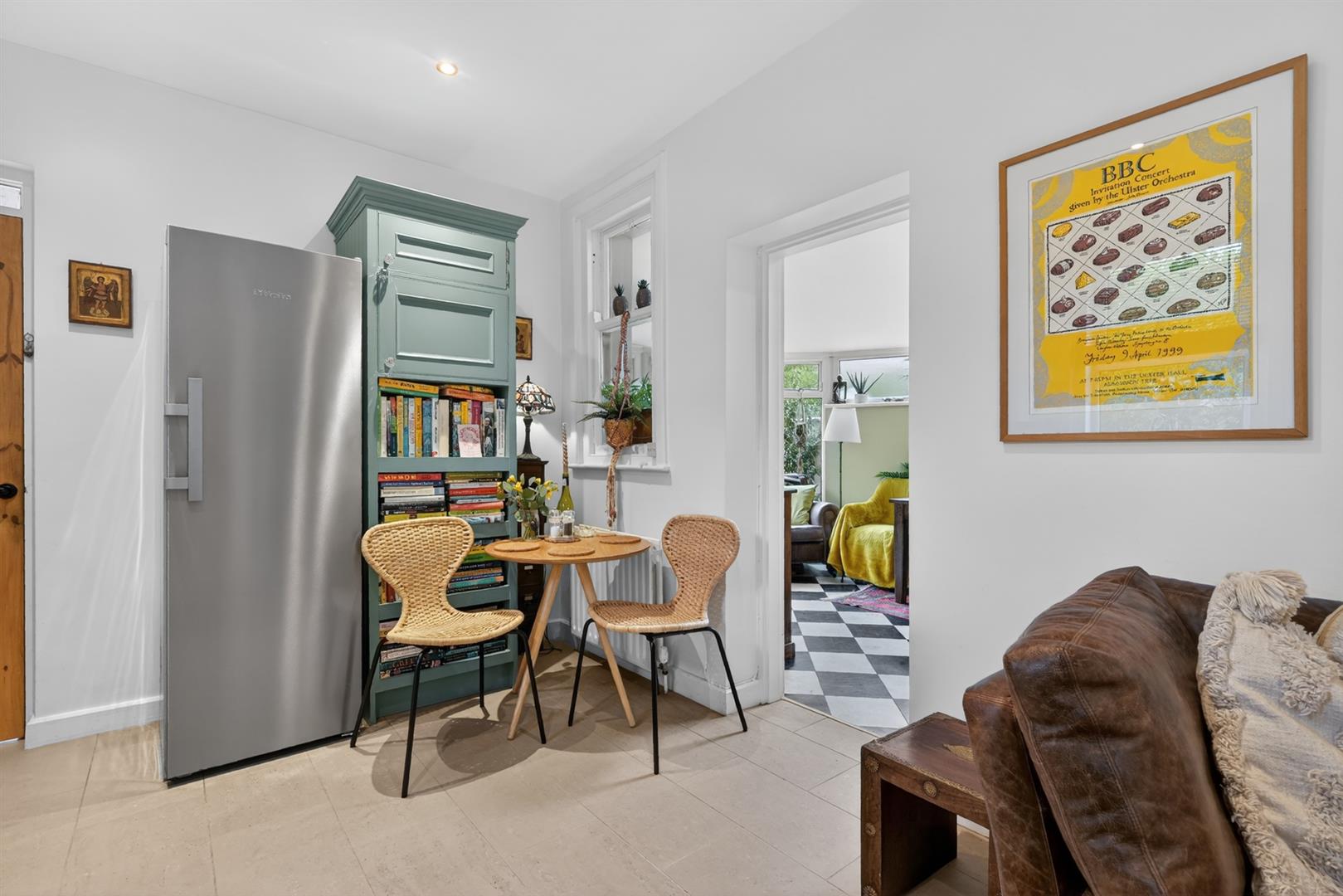 Tiled flooring, Velux, recessed spot lighting. Double doors to garden.