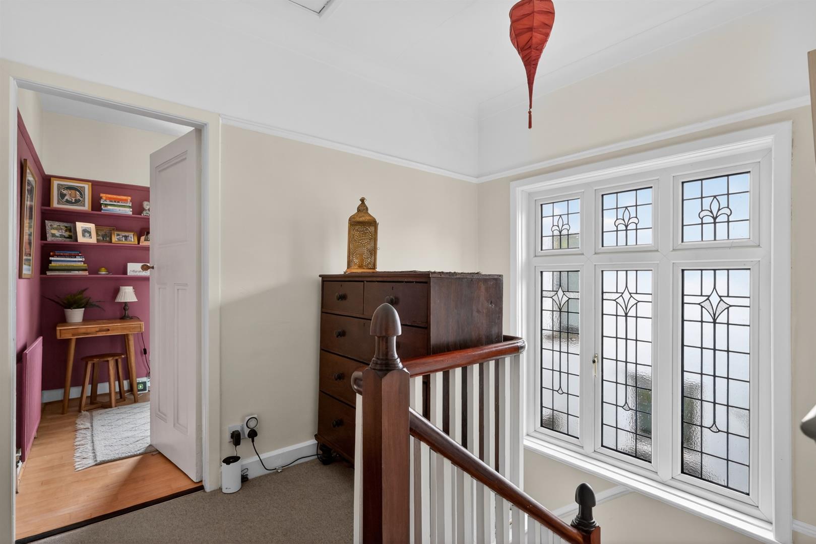 Access to partially floored roof space via slingsby ladder. Leaded glass window.