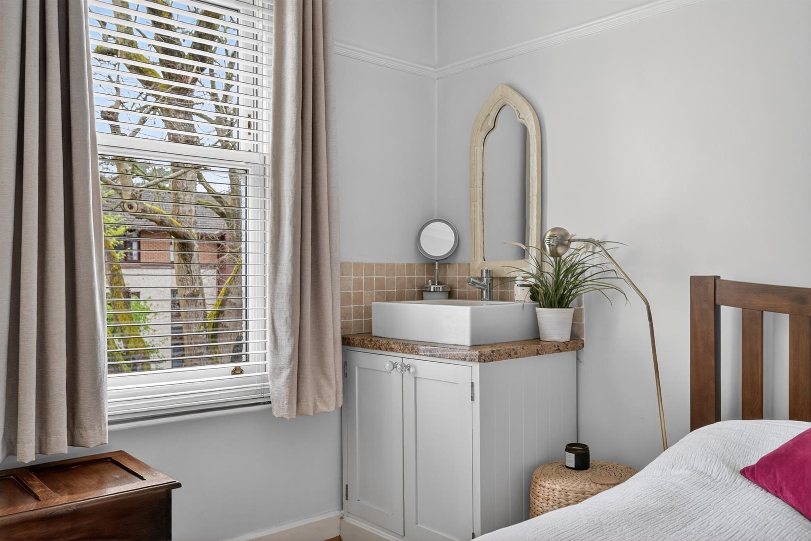 Wash hand basin with storage below, solid wood flooring. Picture rail, cornicing.