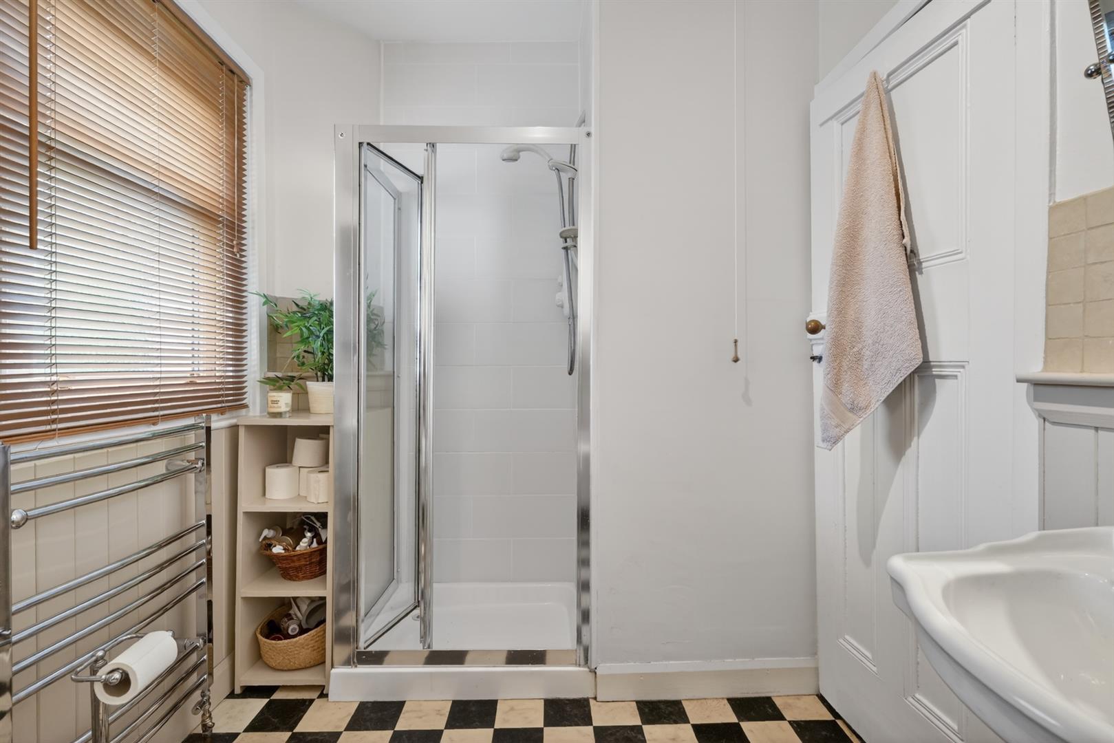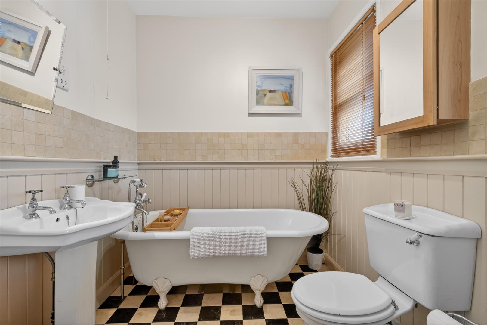Roll top free standing bath with telephone hand shower, walk in fully tiled electric power shower, pedestal wash hand basin, low flush W.C, chrome wall mounted radiator, wood panelling, part tiled walls, tiled flooring.