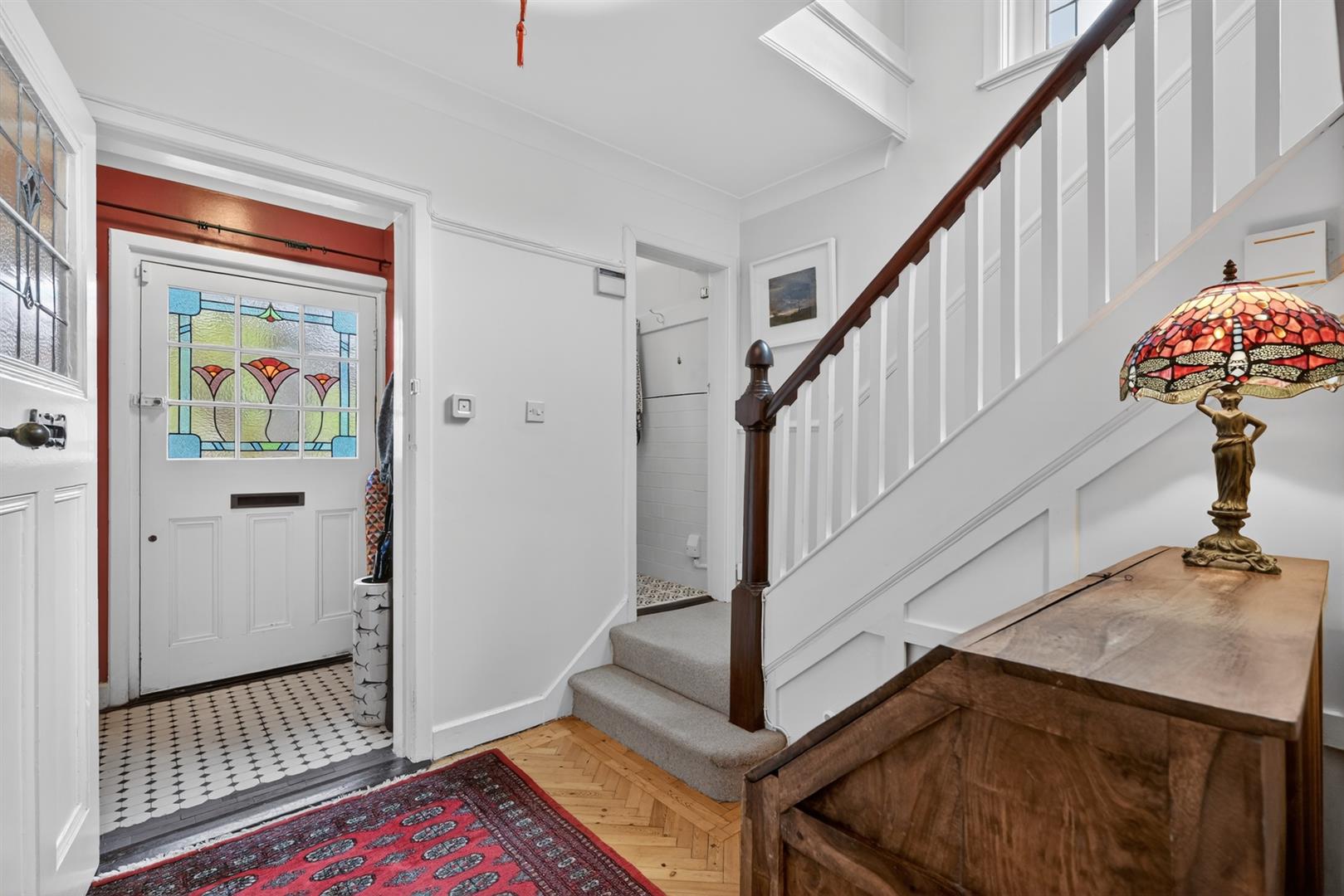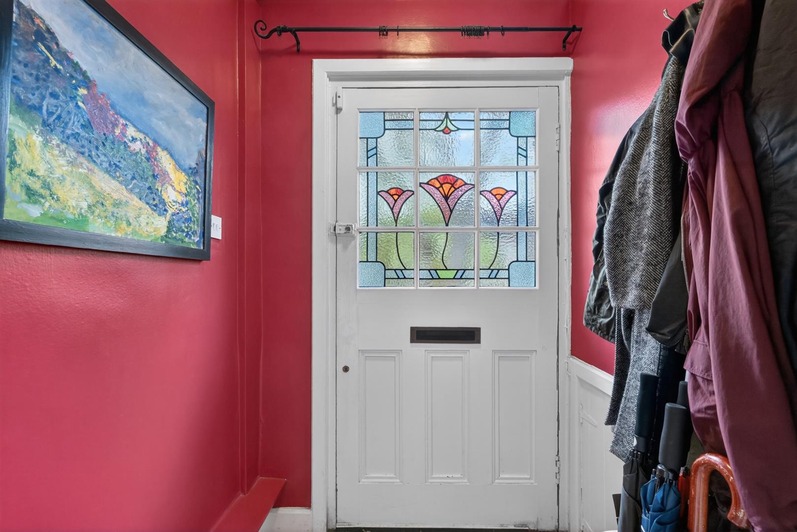 Tiled flooring, hardwood inner door with stained glass.