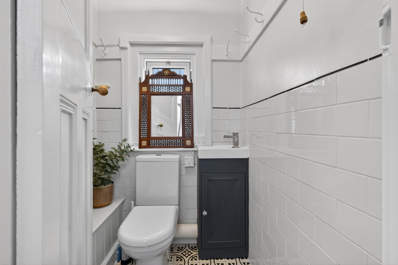 Low flush W.C, wash hand basin with storage below, part tiled walls, ceramic tiled floor.