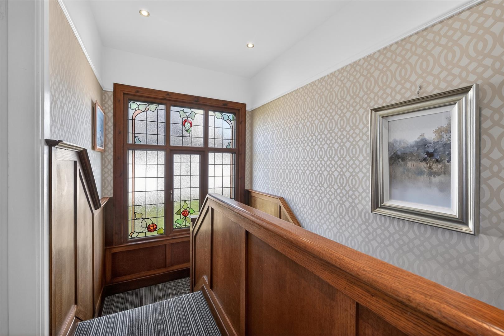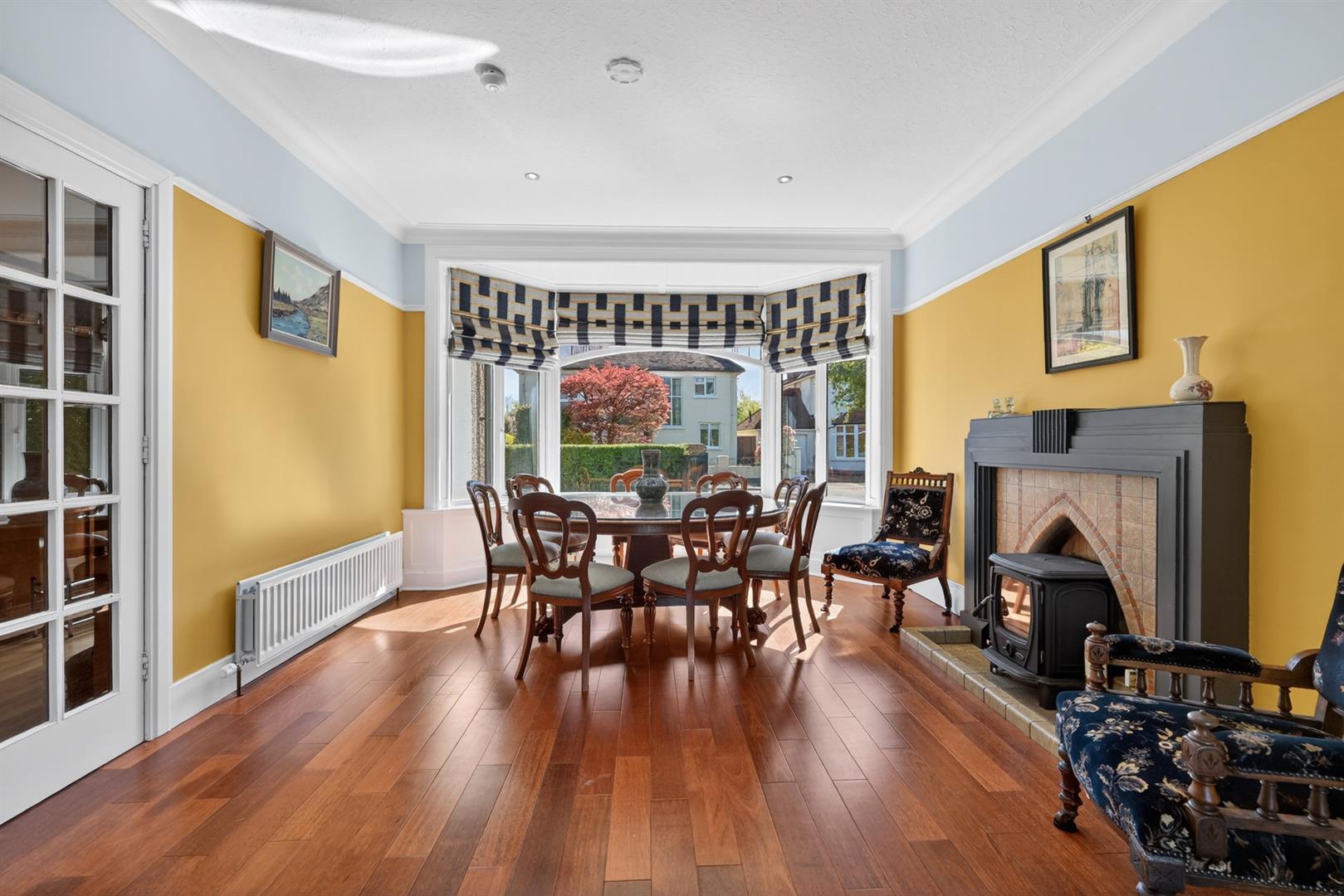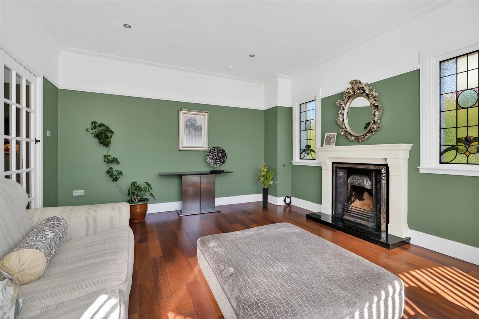 Solid wood flooring, bay window with leaded glass, two side leaded glass feature windows, recessed spotlighting. Attractive gas fire. Picture rail and cornicing.