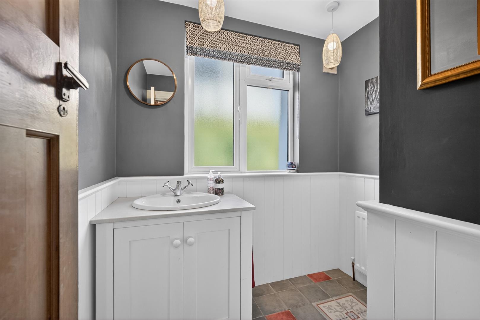 Low flush W.C, wash hand basin with storage below, tiled flooring.