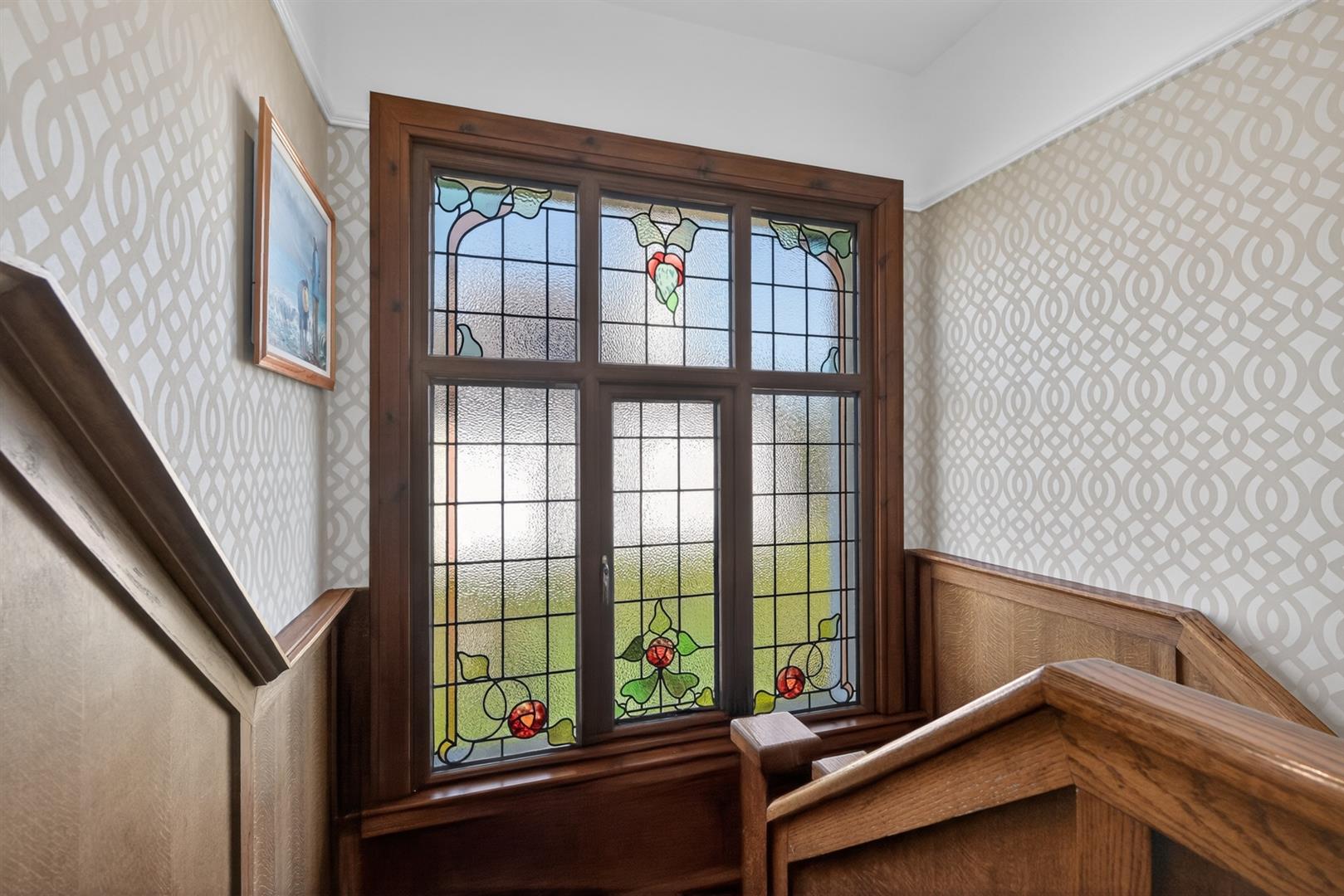 Hardwood front door with leaded glass arch leading to tiled entrance porch.