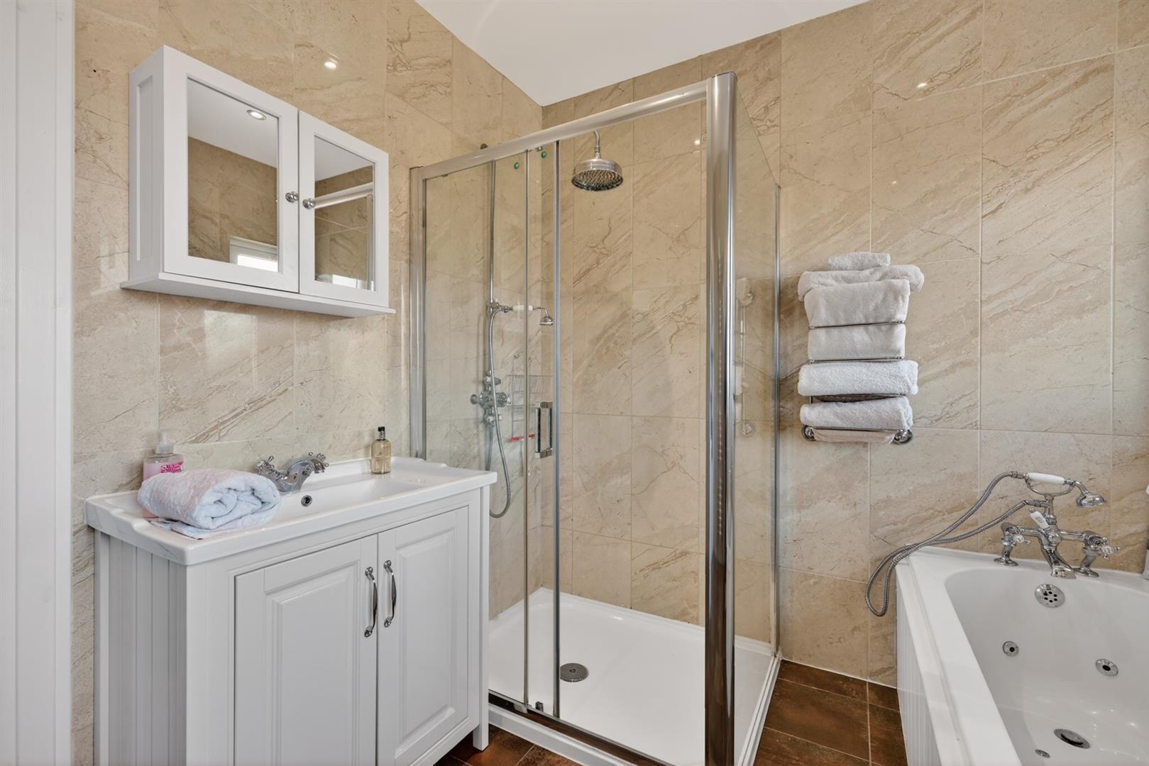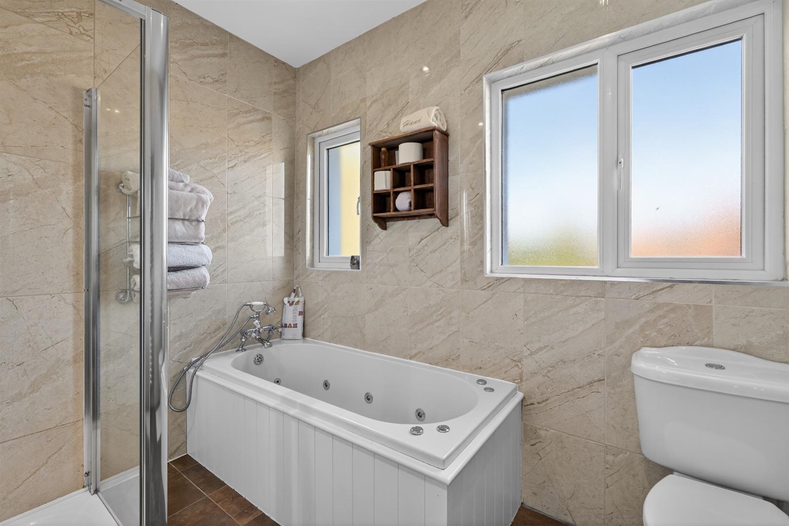 White suite comprising jacuzzi bath, fully tiled walk in shower, low flush W.C, wash hand basin with storage below, fully tiled walls, tiled flooring.