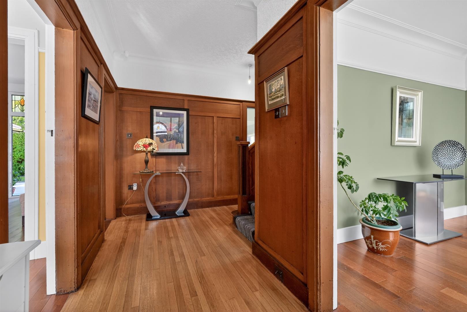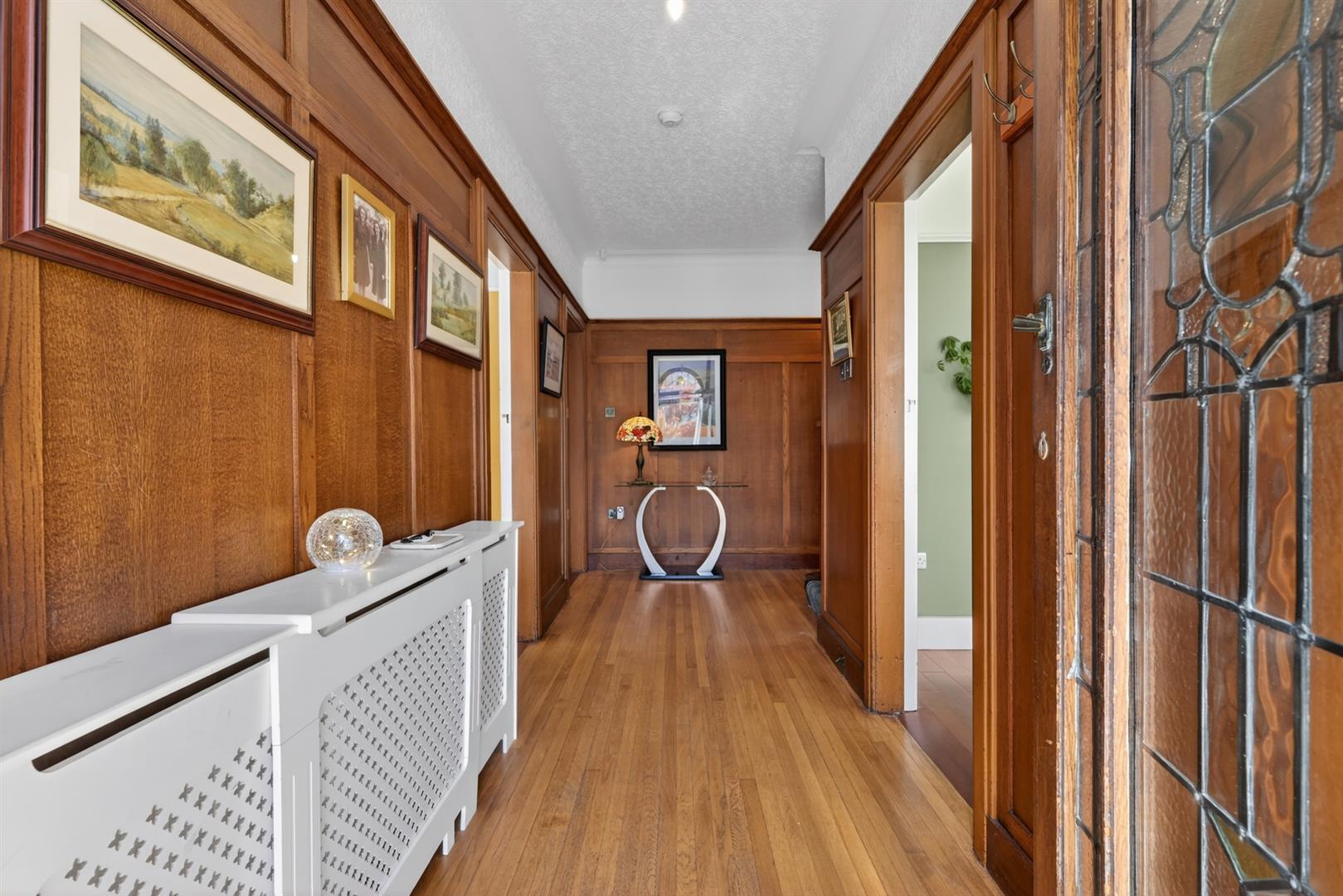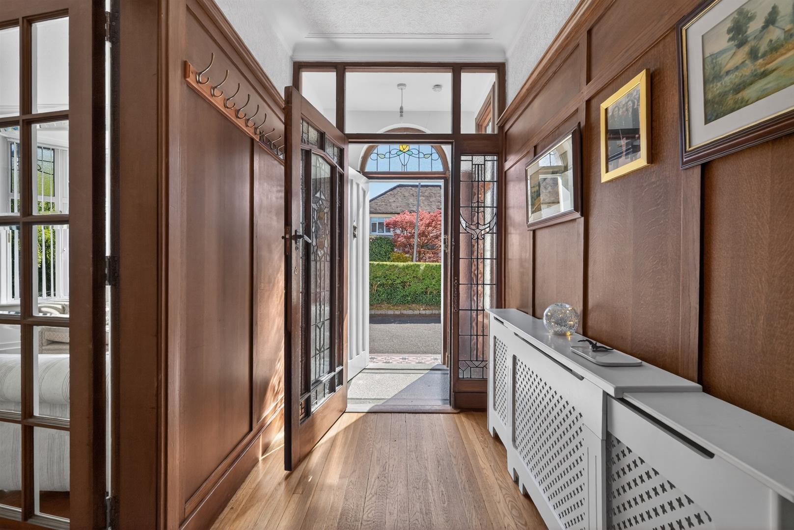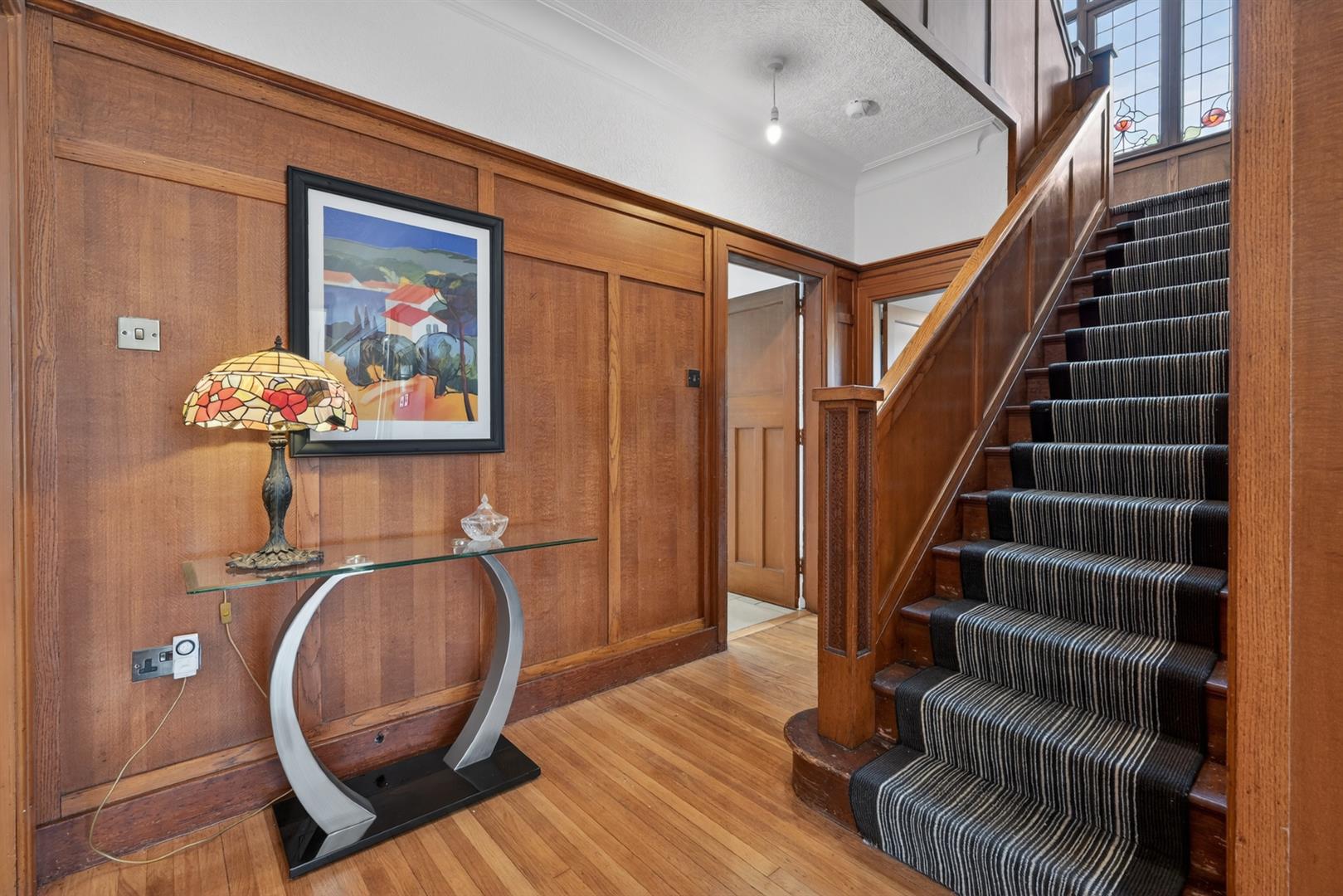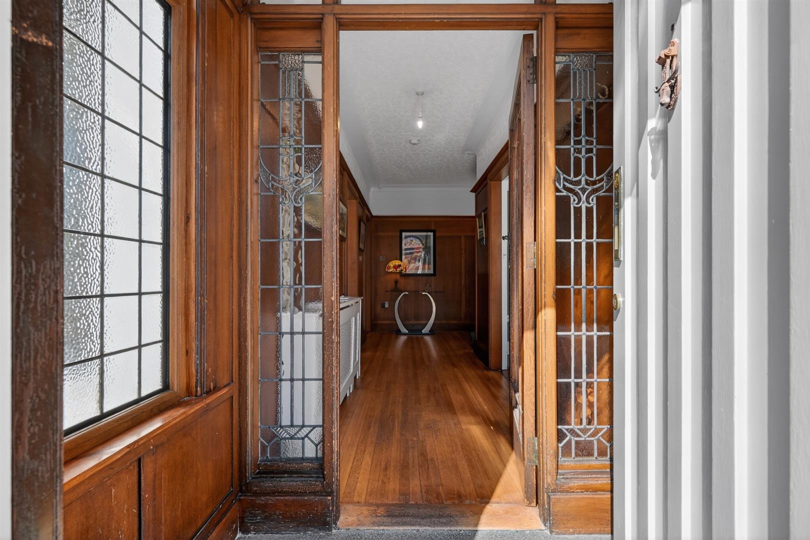 Leaded glass panelled hardwood door. Solid wood flooring. Wood wall panelling.