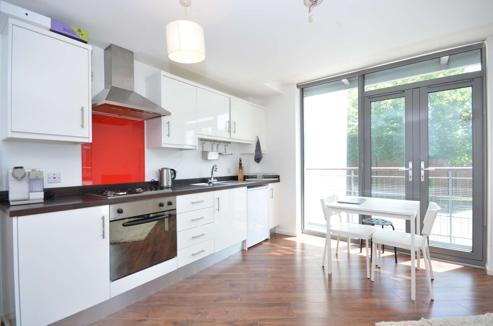 Open plan lounge - kitchen with small balcony, range of built in units, integrated, electric oven & hob, extractor, stainless steel sink & drainer