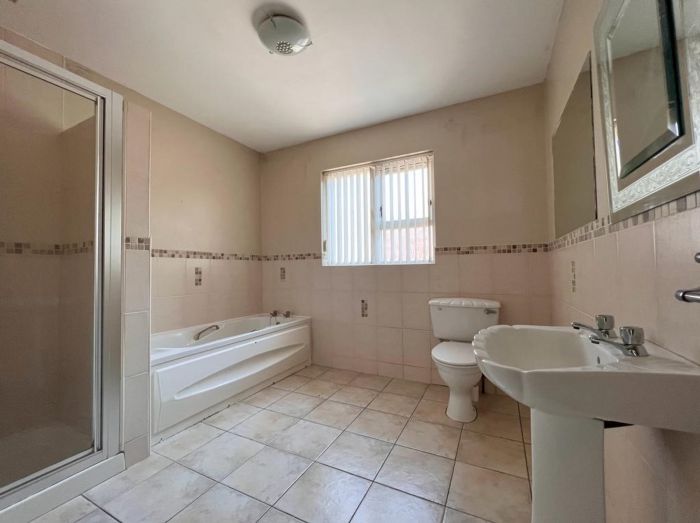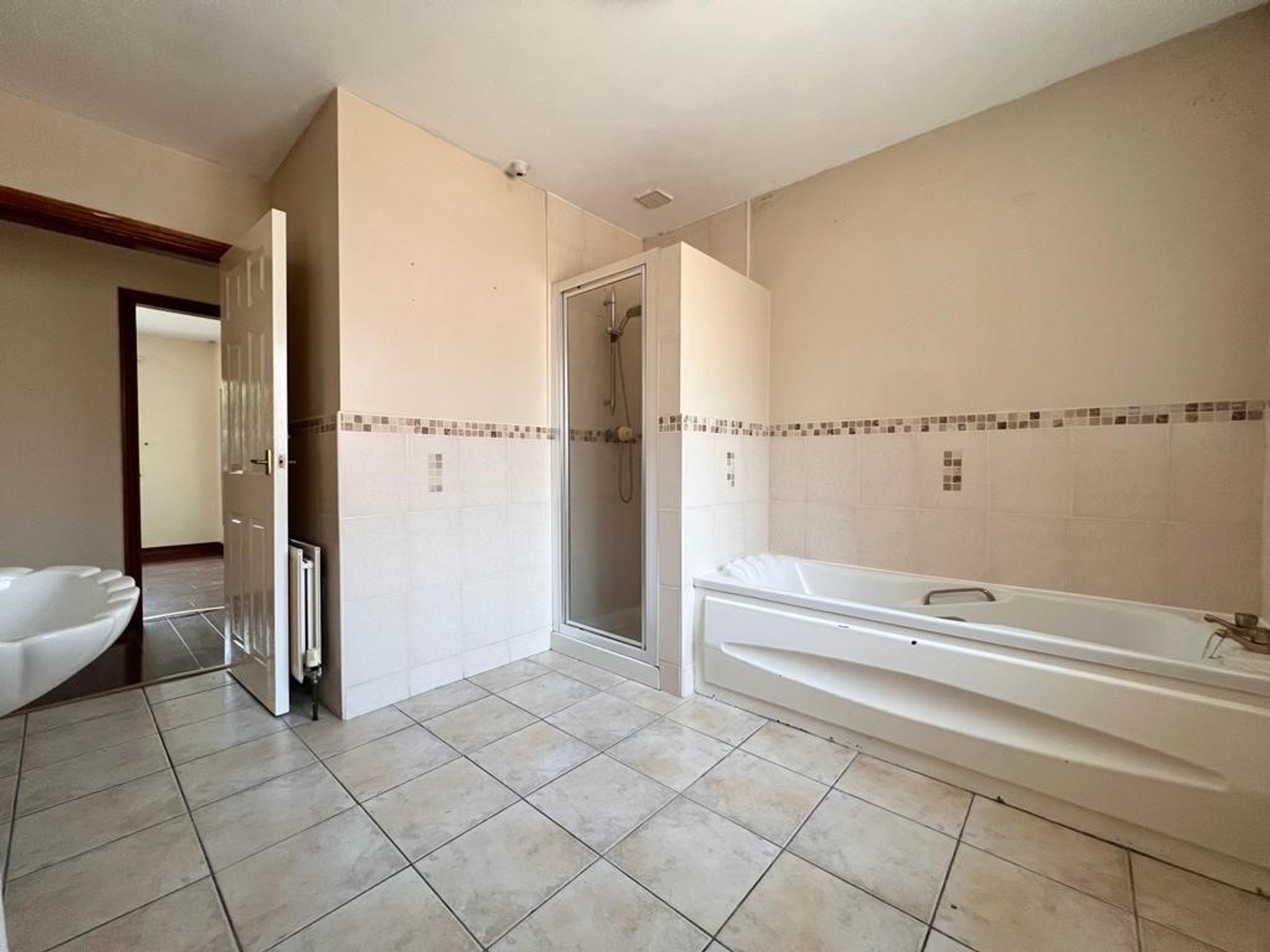 With wc, whb, bath, separate mains shower, walls part tiled, floor fully tiled.