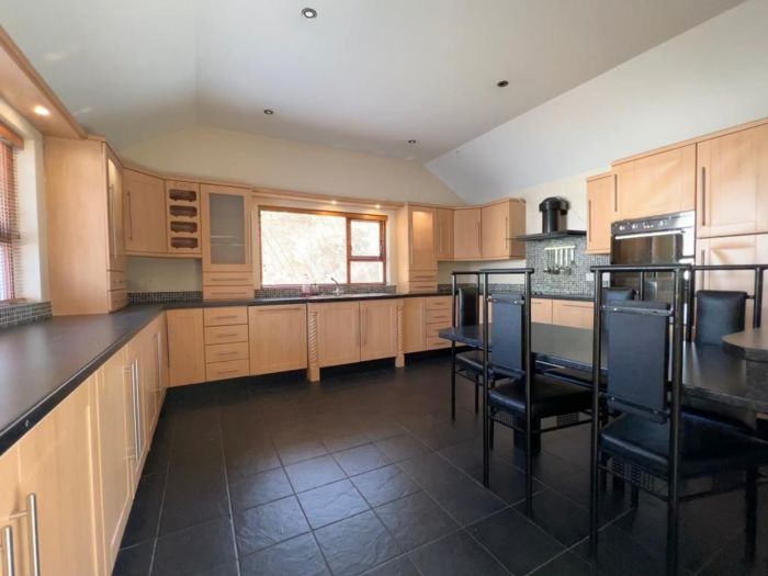 With eye and low level kitchen units, stainless steel sink unit, double electric oven, ceramic hob, integrated dishwasher, integrated fridge freezer, recessed lights, floor tiled, walls part tiled.