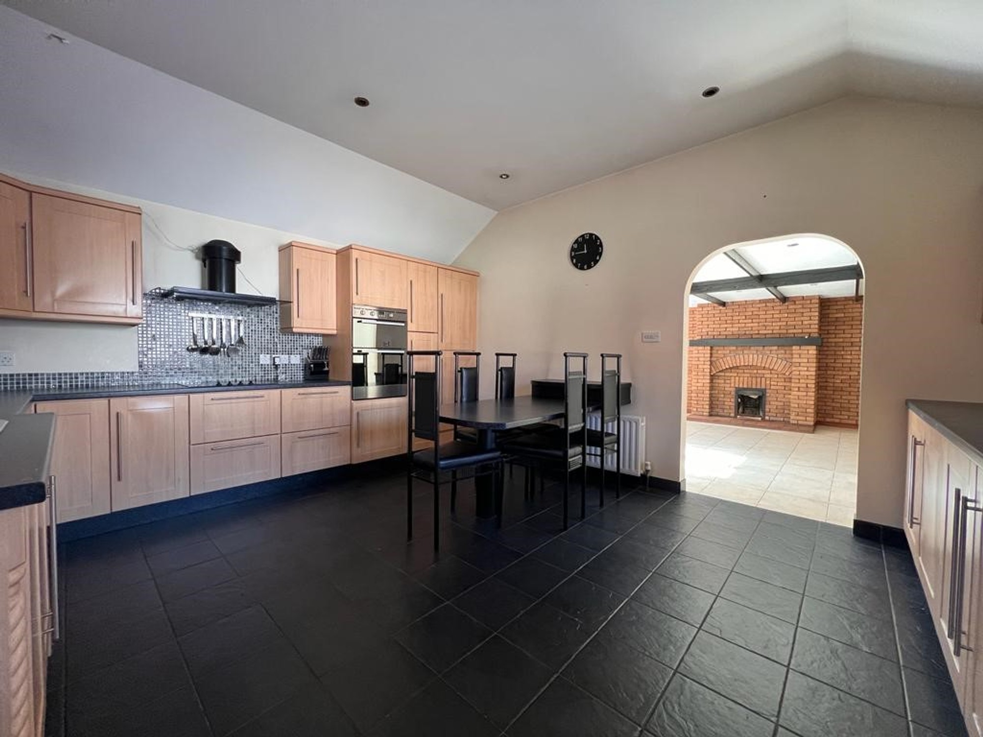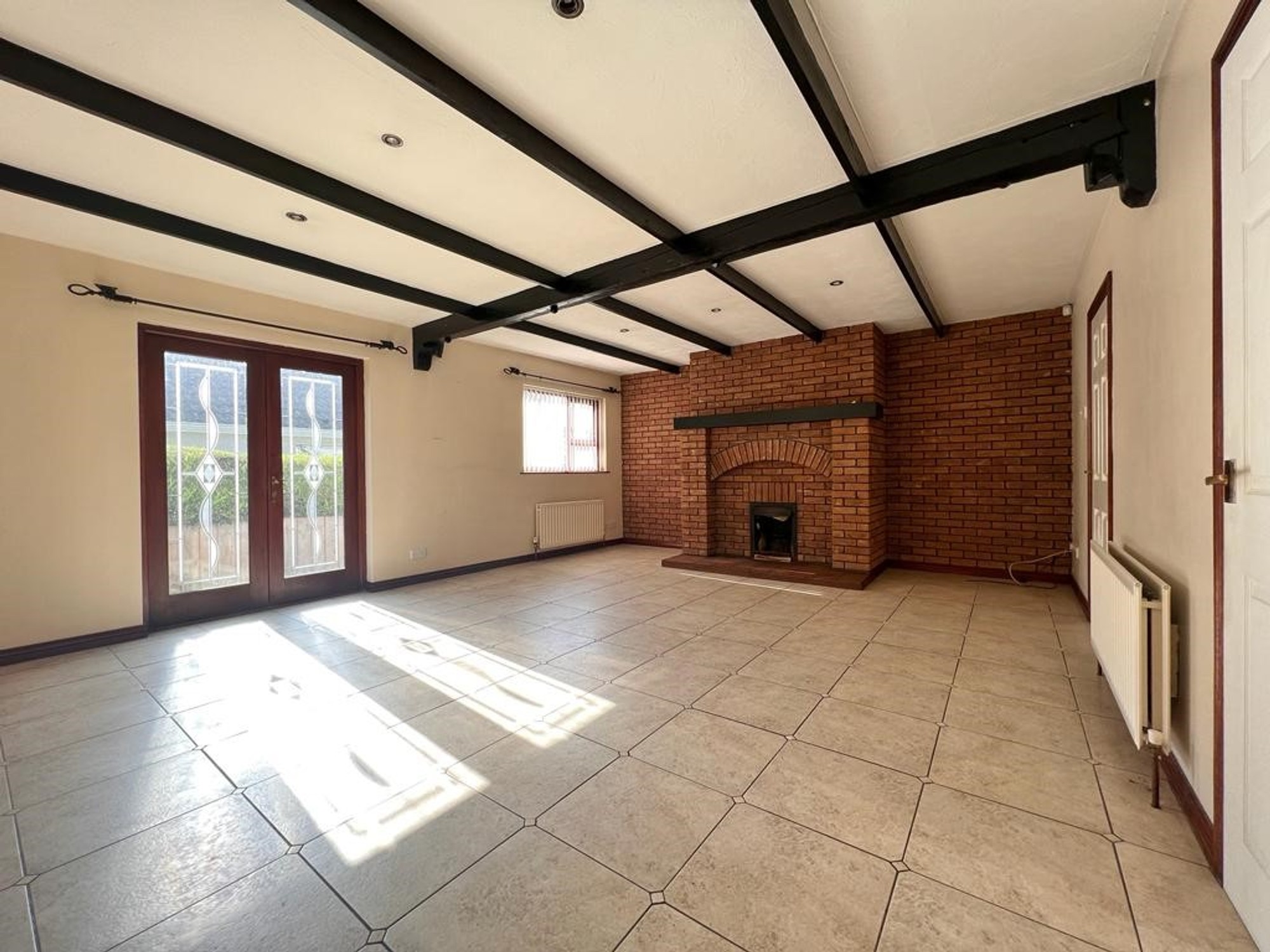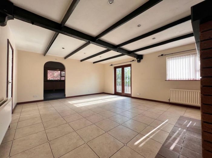 With tile floor, brick built fireplace, recessed lights, ceiling beams & double doors to side of property.