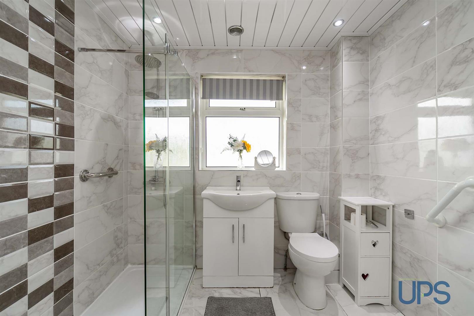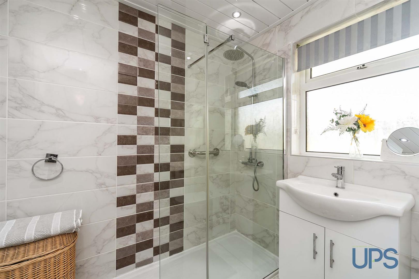 Tiling, ceramic tiled floor, wash hand basin, vanity unit, tiling, ceramic tiled floor, feature shower enclosure thermostatically controlled shower unit.