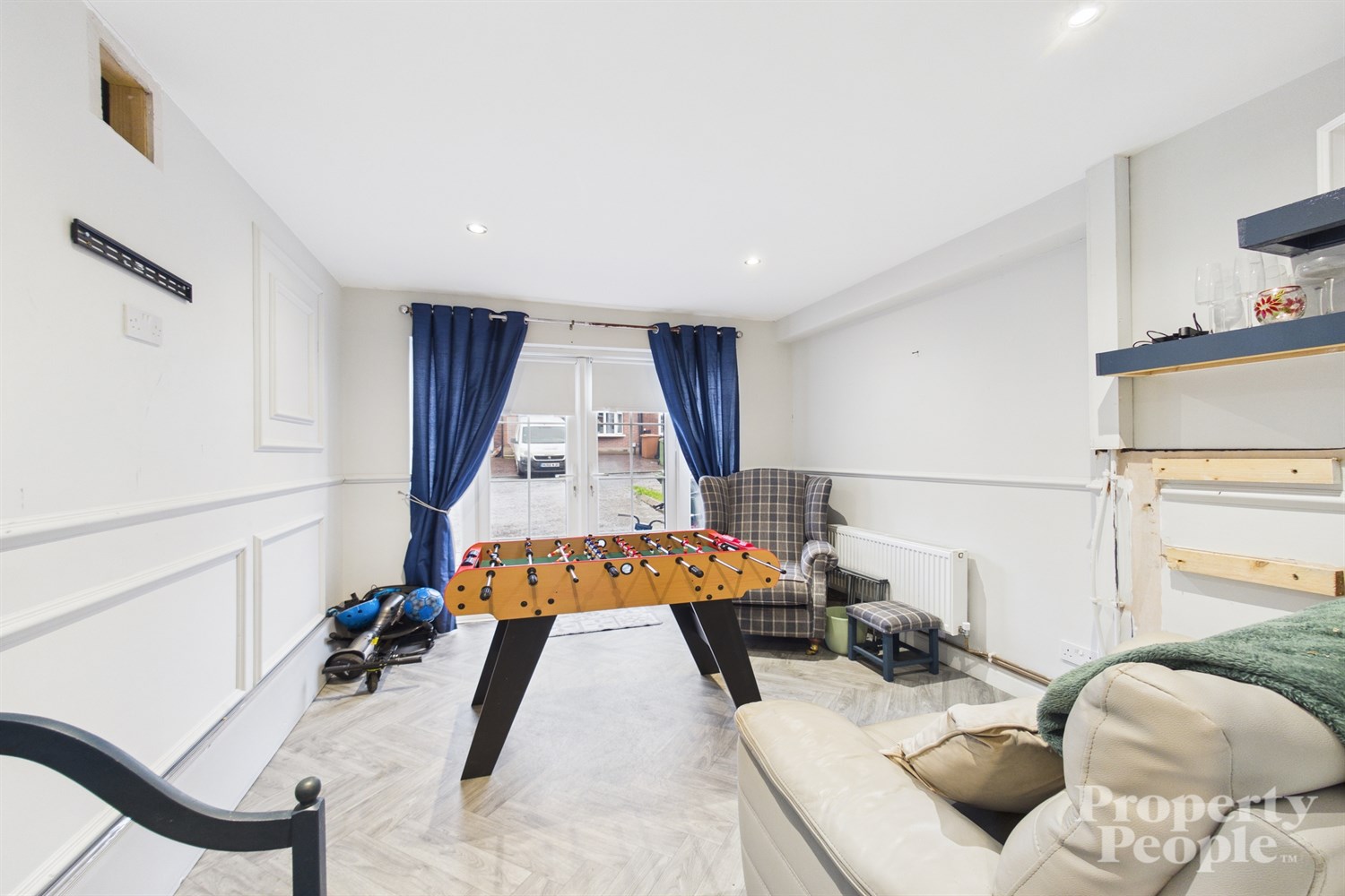 A fantastic multi-purpose space that has been thoughtfully converted to suit a variety of uses. Currently utilised as a games room/den, it would equally lend itself as an ideal home office or business space. uPVC double doors open onto the driveway, flooding the room with natural light, while features include recessed spot lighting, a laminate-effect lino floor and a stylish panelled radiator.