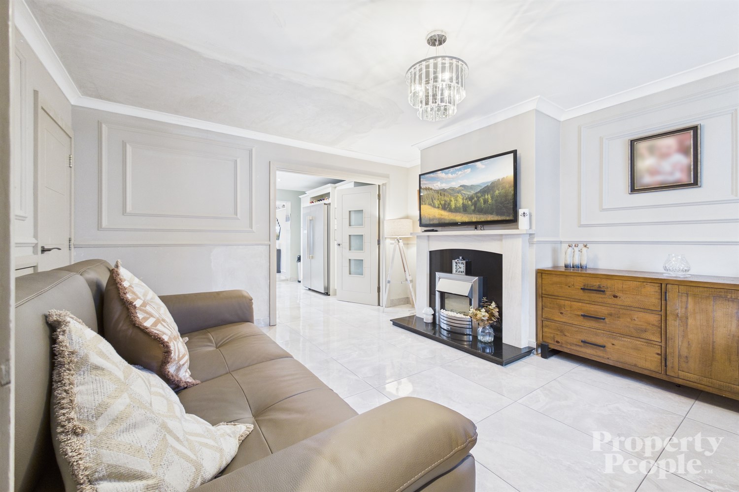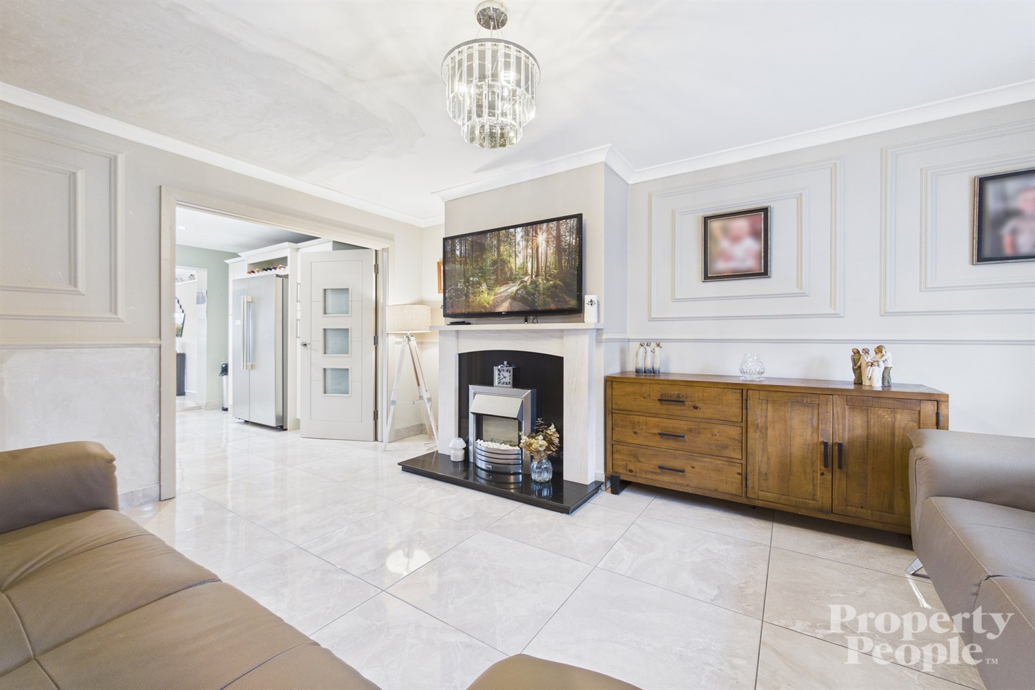 A bright and generously proportioned living room, beautifully finished with an elegant feature ceiling cornice, stylish wall panelling and a sleek tiled floor. A striking feature fireplace with gas fire creates a warm focal point, while abundant natural light pours in through double doors, seamlessly leading through to your kitchen.