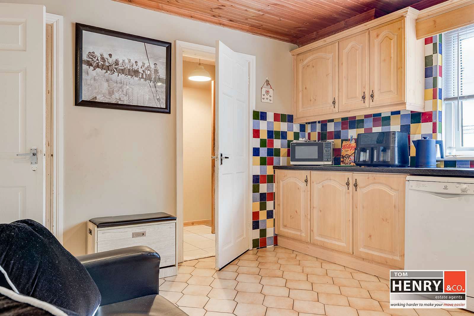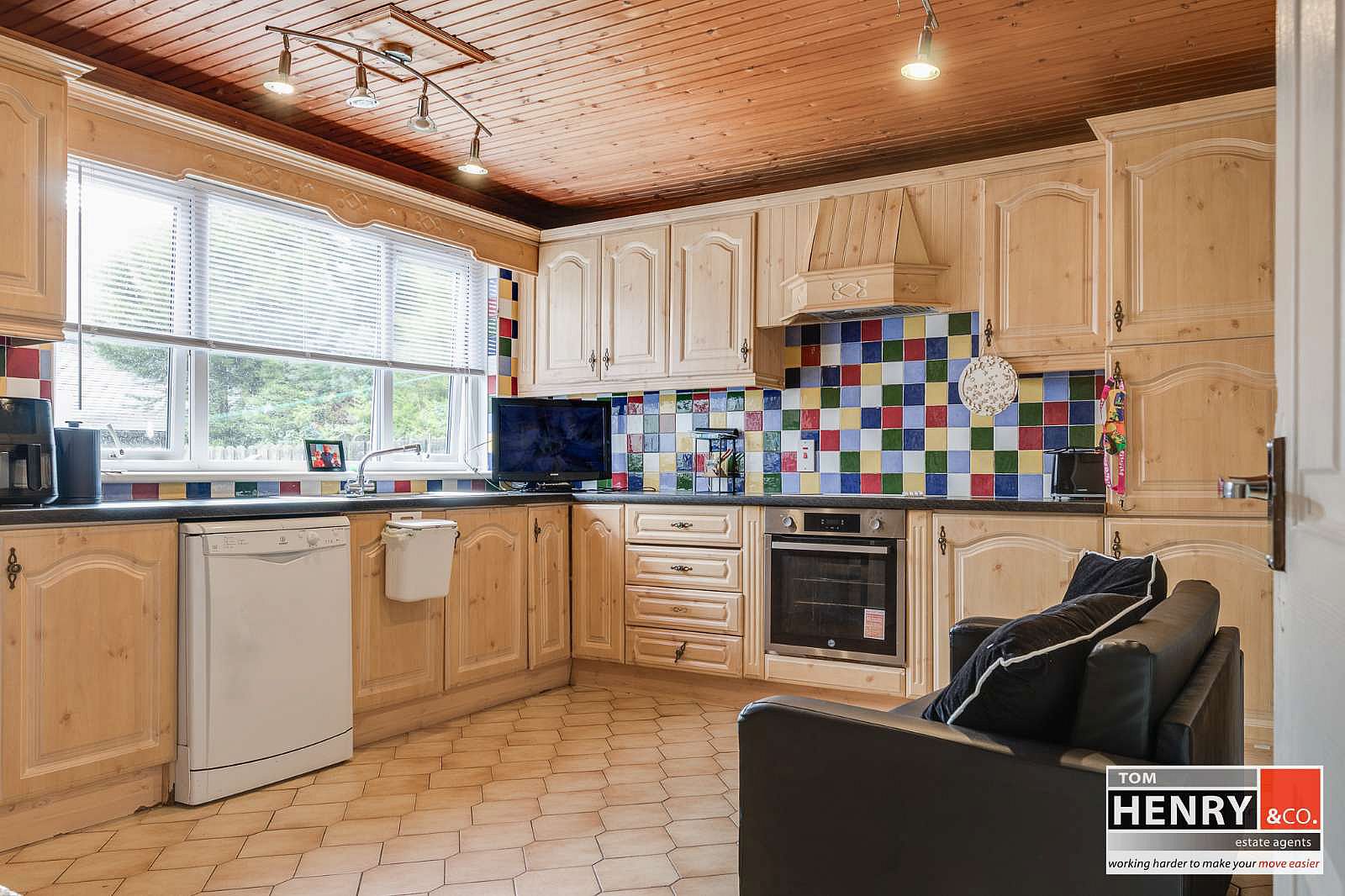 FITTED HIGH & LOW LEVEL UNITS. PELMET OVER S.S. SINK & DRAINER WITH MIXER TAP FITTING. INTEGRATED HOB & UNDER OVEN WITH X-FAN OVER. SPACE FOR DISHWASHER. TILED BETWEEN UNITS. TILED FLOOR. WOODEN CEILING.