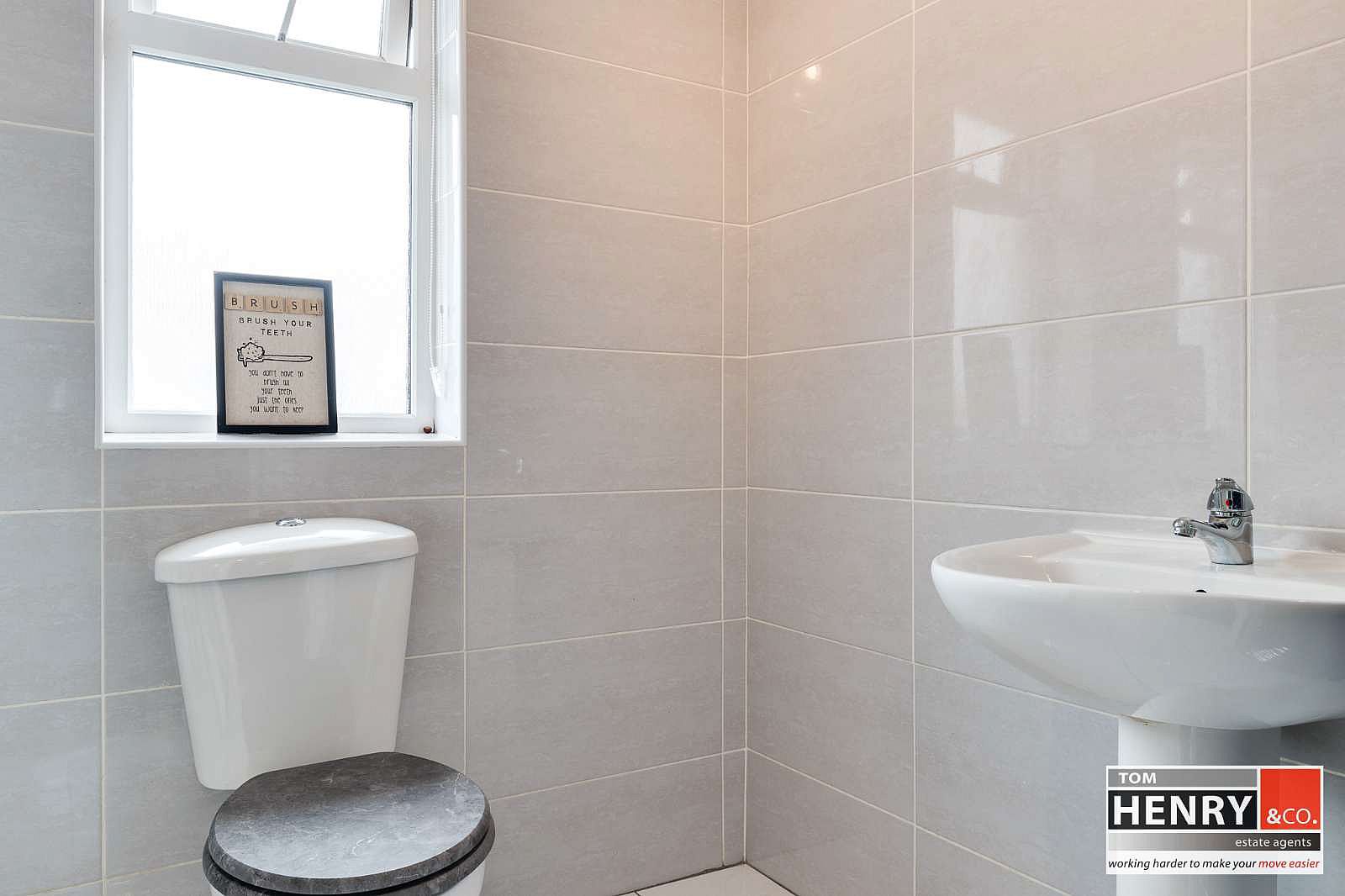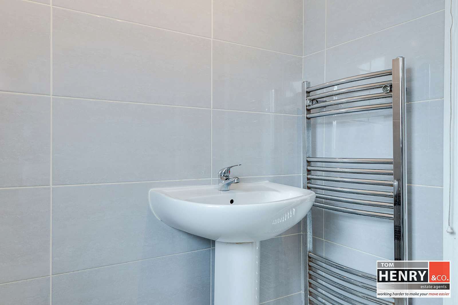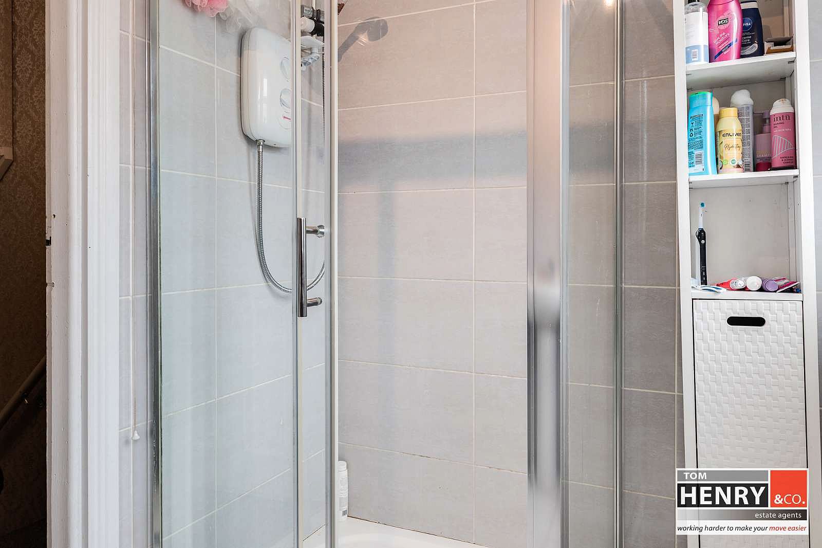 TILED ELECTRIC SHOWER. WASH HAND BASIN WITH MIXER TAP FITTING. TOILET. HEATED TOWEL RAIL. TILED WALLS & FLOOR.