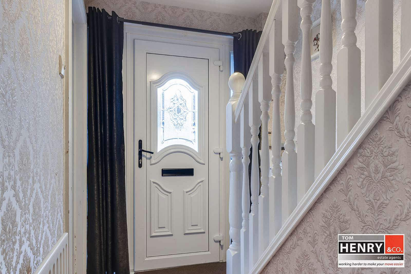 U.P.V.C EXTERNAL DOOR WITH GLAZED PANEL & SIDE PANELS. PRE-FINISHED FLOOR. CARPET TO STAIRS TO FIRST FLOOR.