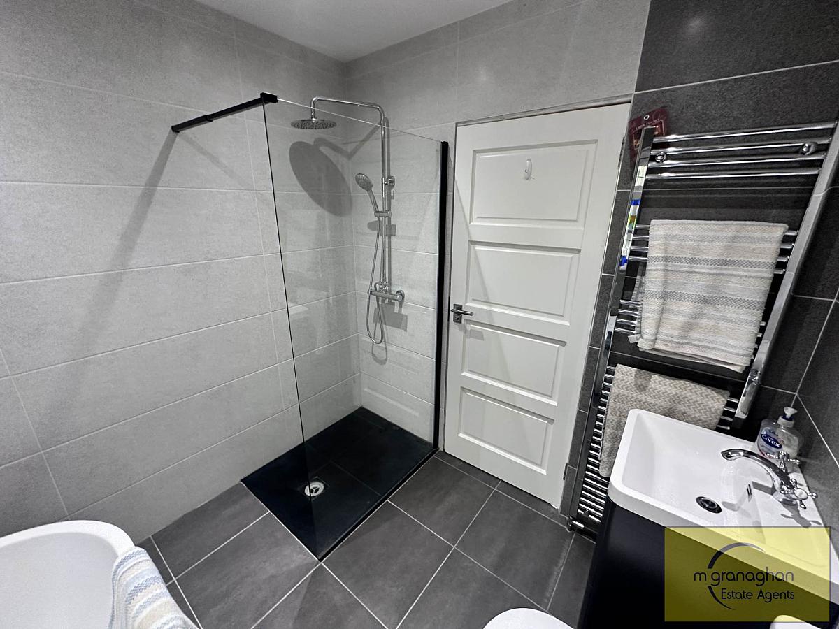 White suite comprising of walk in shower and over head electric shower, low flush WC, wash hand basin, pvc wall covering, chrome towel rail