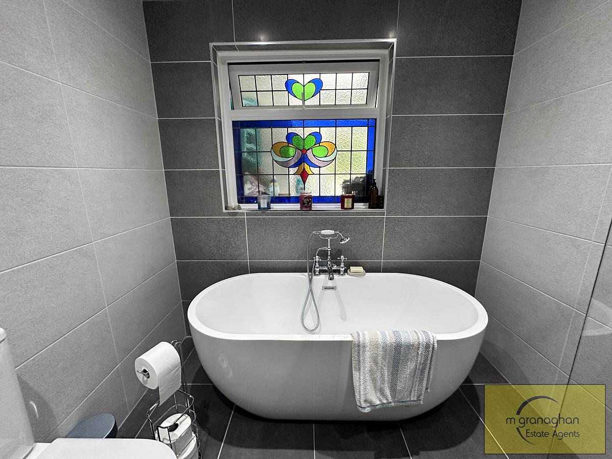 There are three bedrooms in total, with the master bedroom boasting an ensuite with an enclosed shower. The sleek and modern family bathroom features a free-standing bath and shower facilities, perfect for unwinding after a long day.