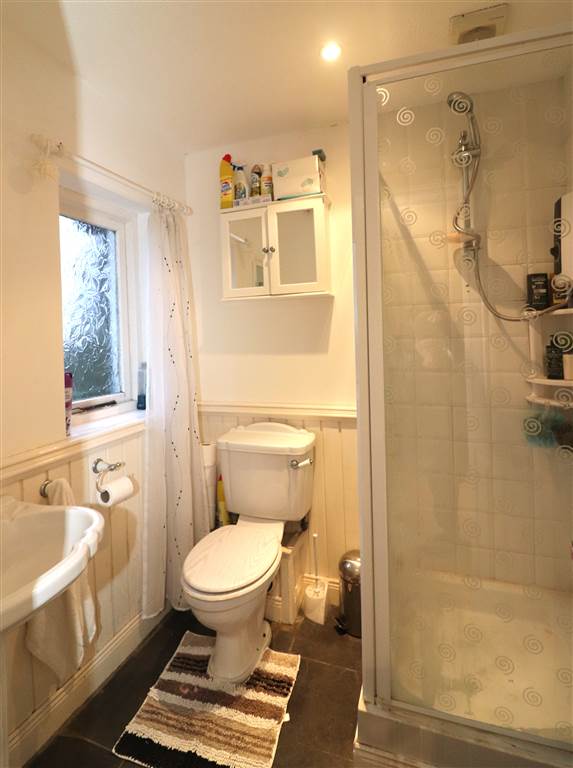 White suite. Shower cubicle with electric shower. Pedestal wash hand basin. Low flush WC. Recessed lights. Extractor fan. Part wood panelled walls. Tiled floor.