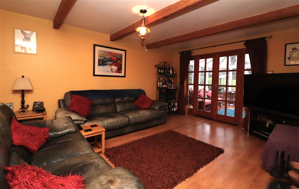 Feature fireplace with cast iron and tiled inset, slate hearth and open fire. Beamed ceiling. Laminate flooring. French doors to conservatory.
