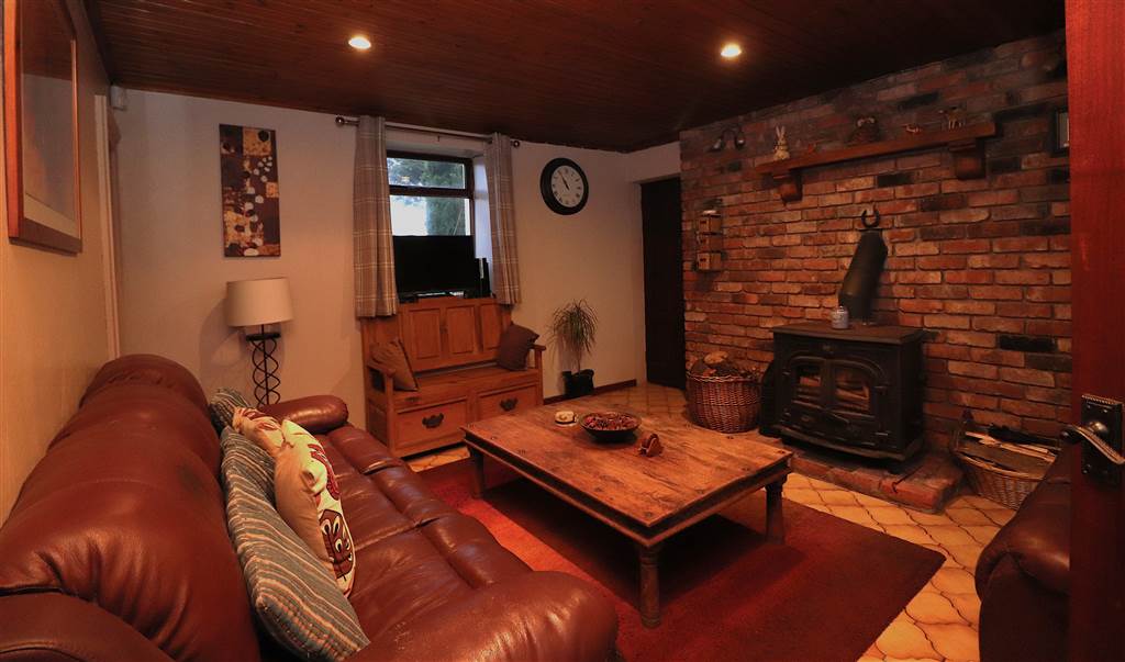Feature reclaimed brick fireplace with multi fuel stove connected to heating system providing hot water and heating. Tiled floor. Wood panelled ceiling with recessed lights.
