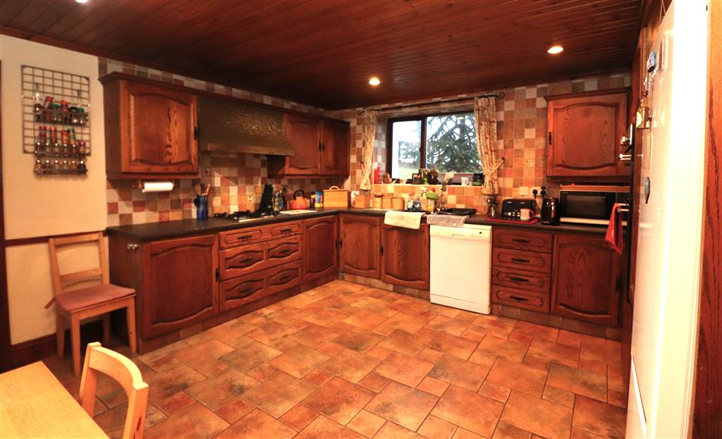 Good range of high and low level units. One and a half bowl sink unit with mixer taps. Built in gas hob and electric double oven. Extractor fan. Plumbed for dishwasher. Tiled floor. Wood panelled ceiling with recessed lights. Sliding barn door from family room.