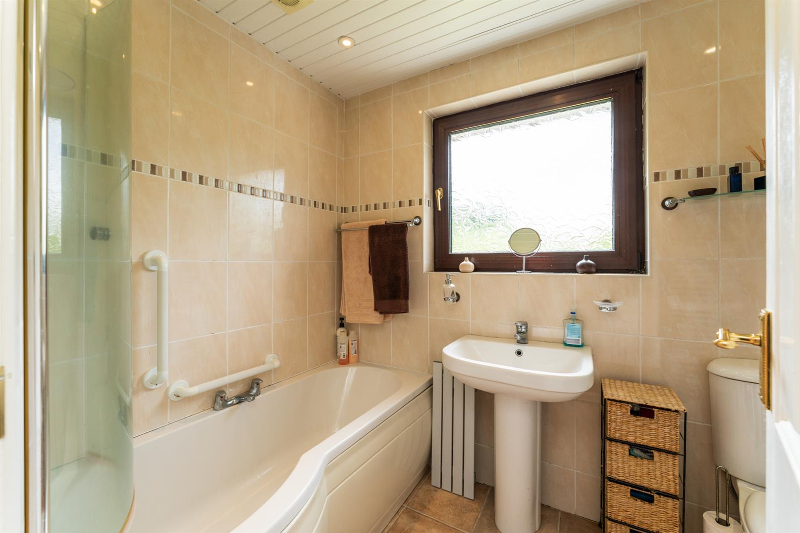 White suite comprising panelled shower bath with mixer tap, Triton electric shower, pedestal wash hand basin, low flush WC, fully tiled walls.