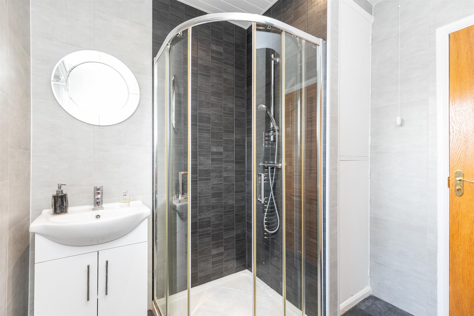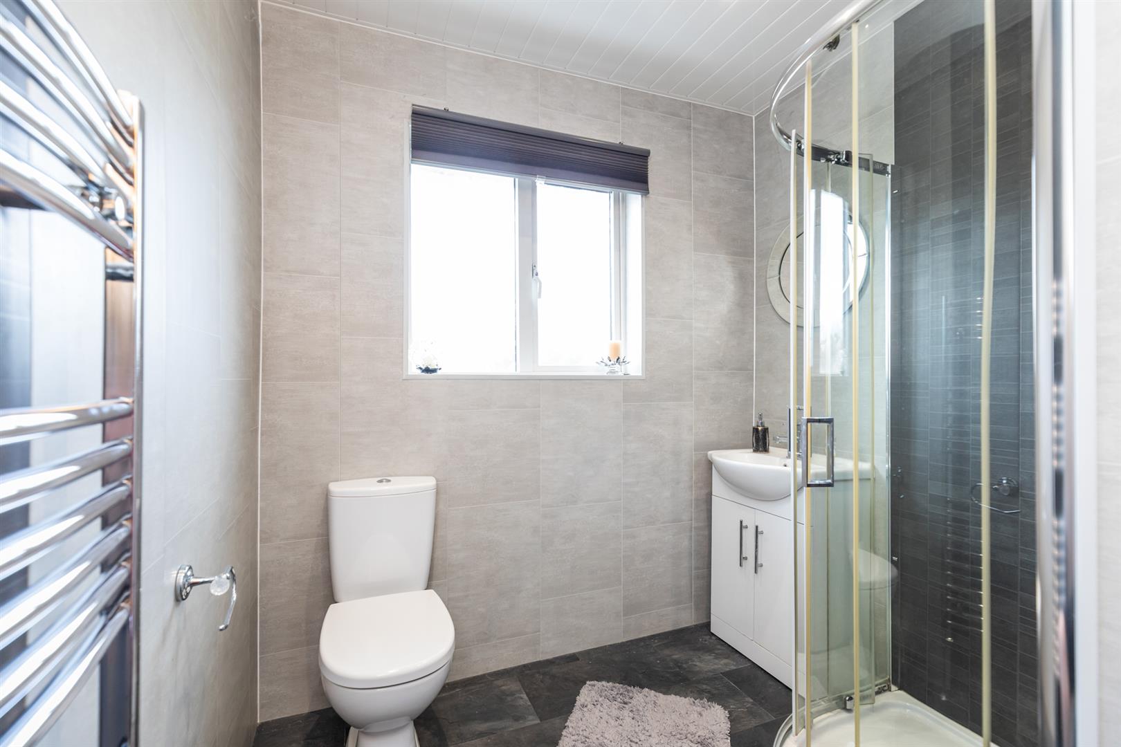 Modern white suite comprising walk-in shower cubicle with built-in shower and sliding shower doors, vanity unit with mixer tap, low flush WC, chrome feature radiator, PVC wall cladding, tile effect laminate flooring, PVC panel ceiling with recessed spotlighting, cupboard with gas fired boiler.