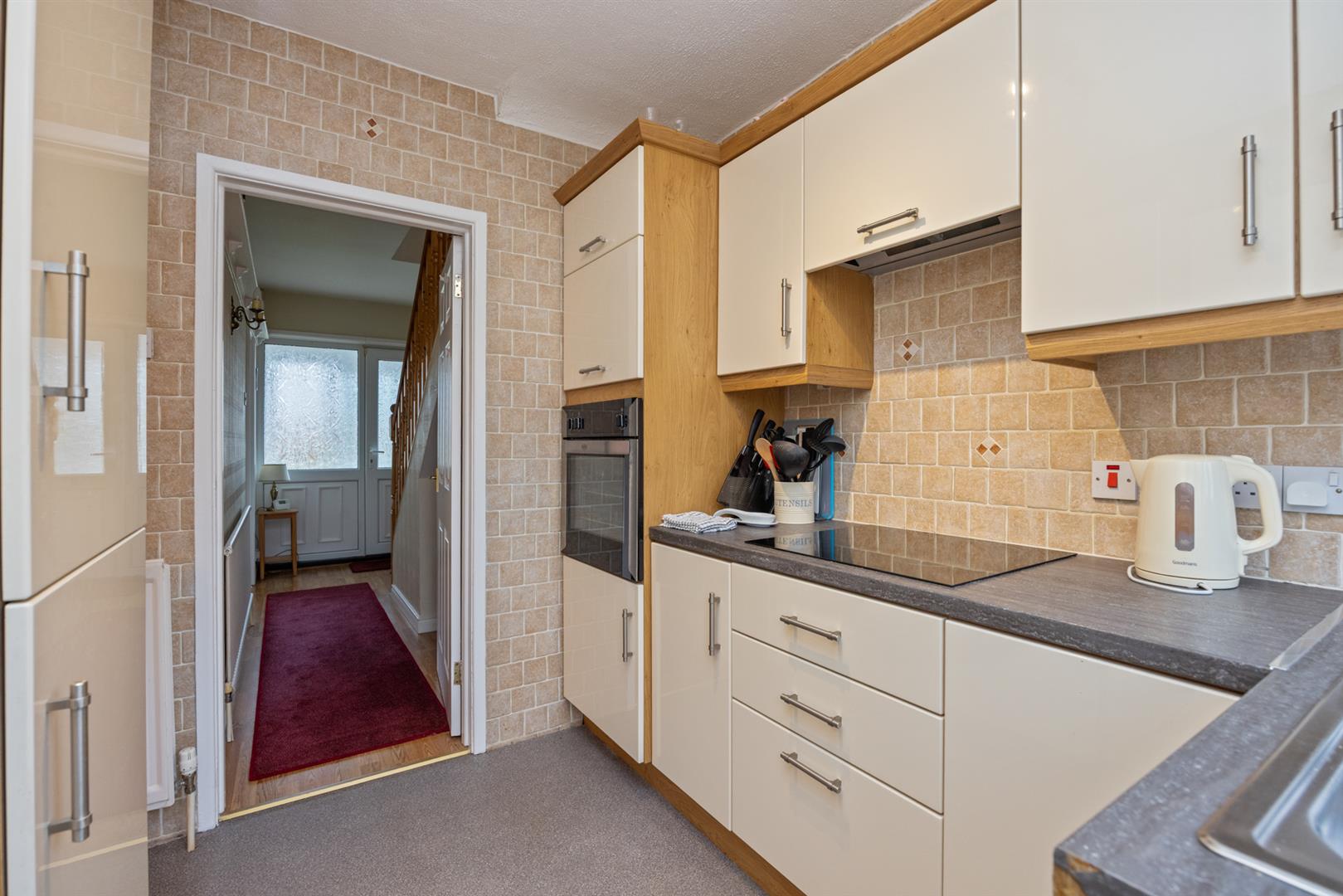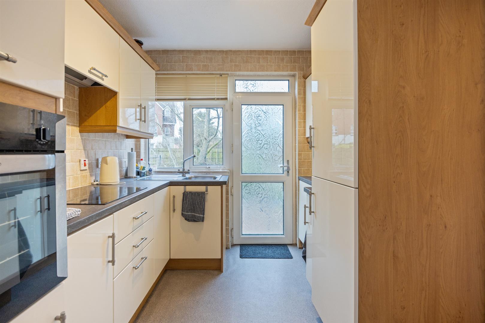 The kitchen is fitted with a range of high and low level units, integrated oven, ceramic hob with extractor fan, and fridge/freezer, with access to the rear garden.