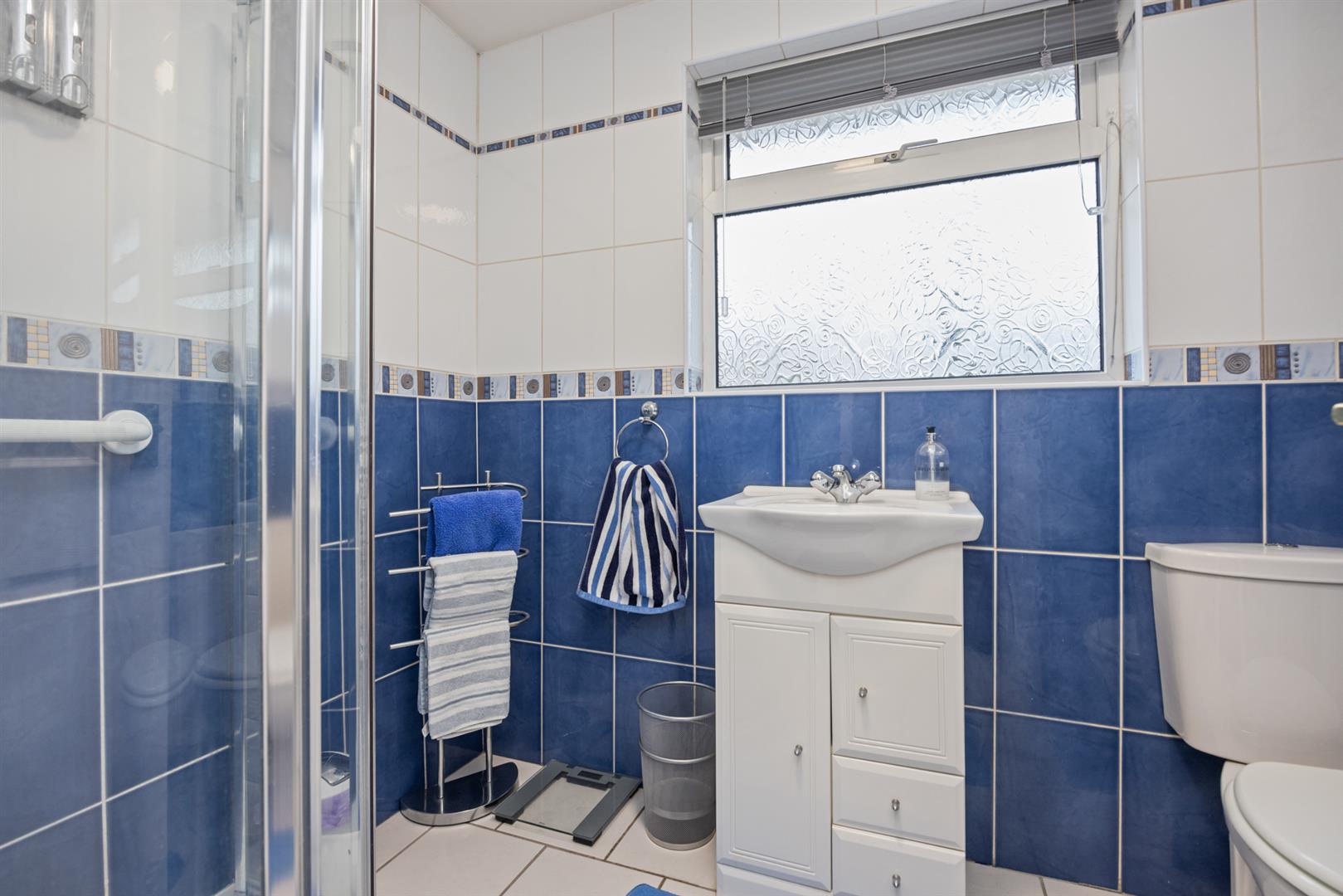 White suite comprising: Low flush WC, vanity unit with mixer tap, walk in shower cubicle with electric shower, fully tiled walls and fully tiled floor, storage cupboard housing gas fired boiler.