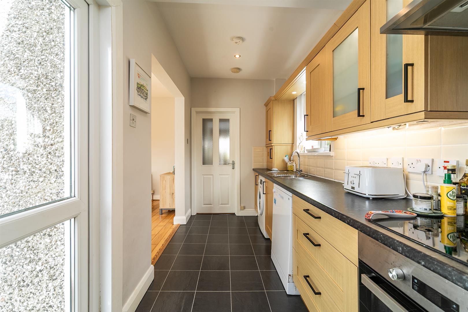 Excellent range of high and low level units, single drainer stainless steel sink unit with mixer tap. Built in stainless steel under oven, ceramic hob and stainless steel extractor hood, plumbed for dishwasher and washing machine. Integrated fridge/freezer, recessed spotlighting, gas fired boiler.