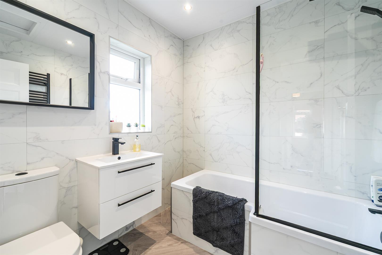 Upstairs, the landing leads to three bedrooms, including one with built-in robes, and a well-appointed family bathroom featuring a panelled bath with shower over, vanity unit, low flush WC, panelled walls, and a black wall-mounted radiator.