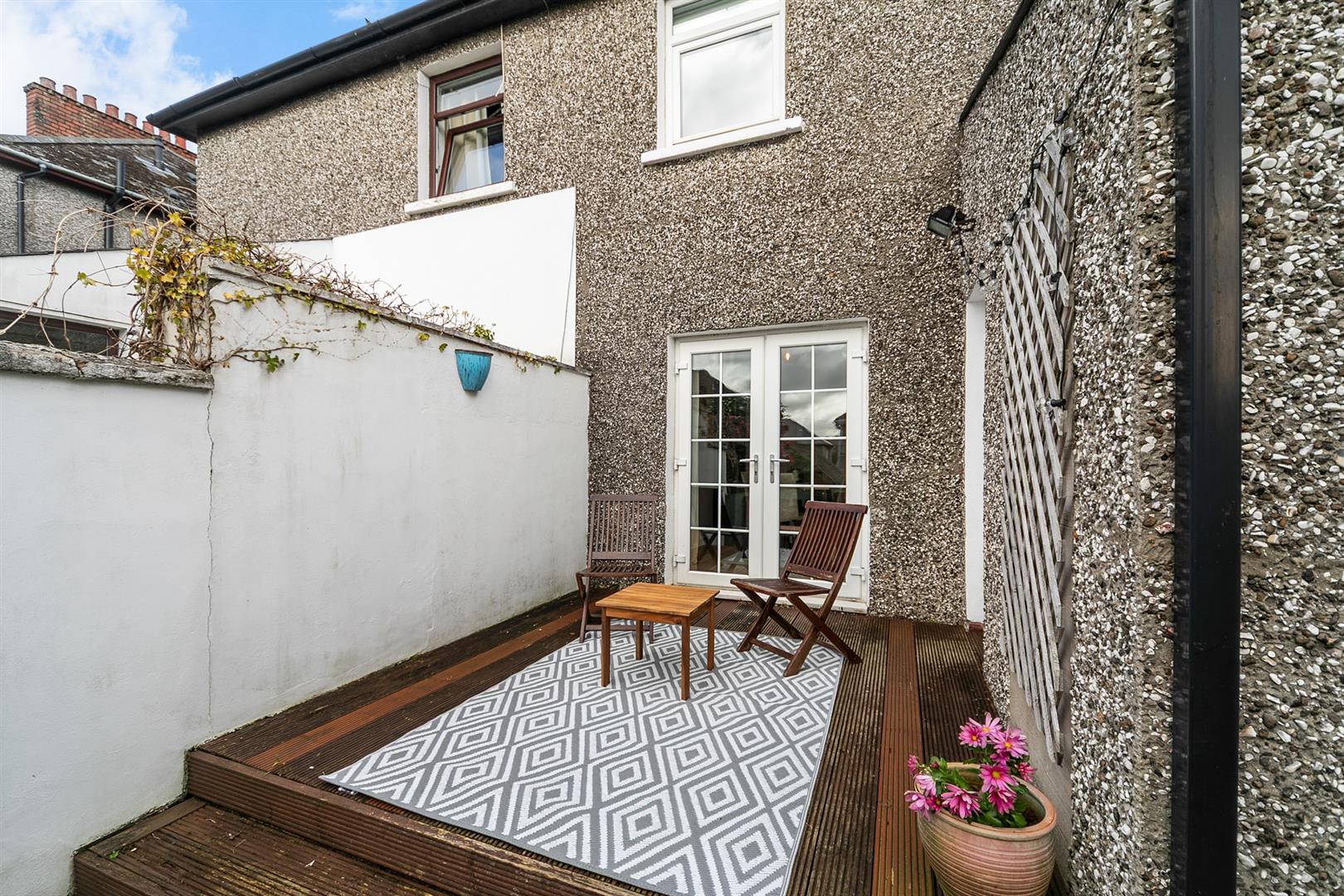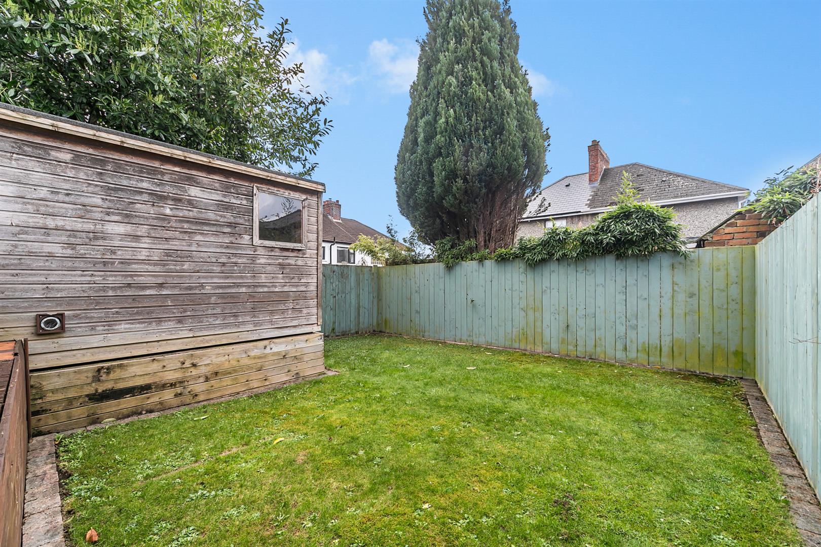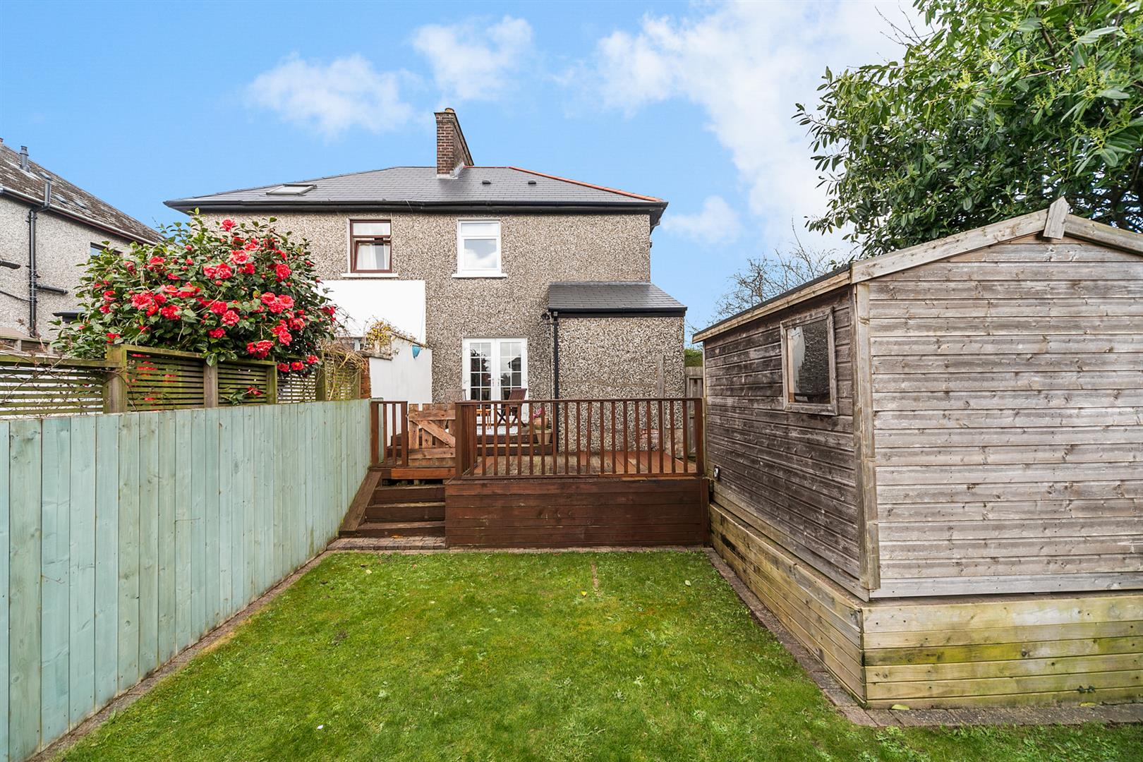 Enclosed Rear Garden With Raised Decking Area And Lawn