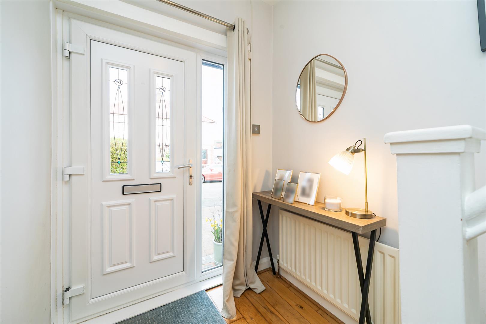 PVC front door, solid strip wood flooring.