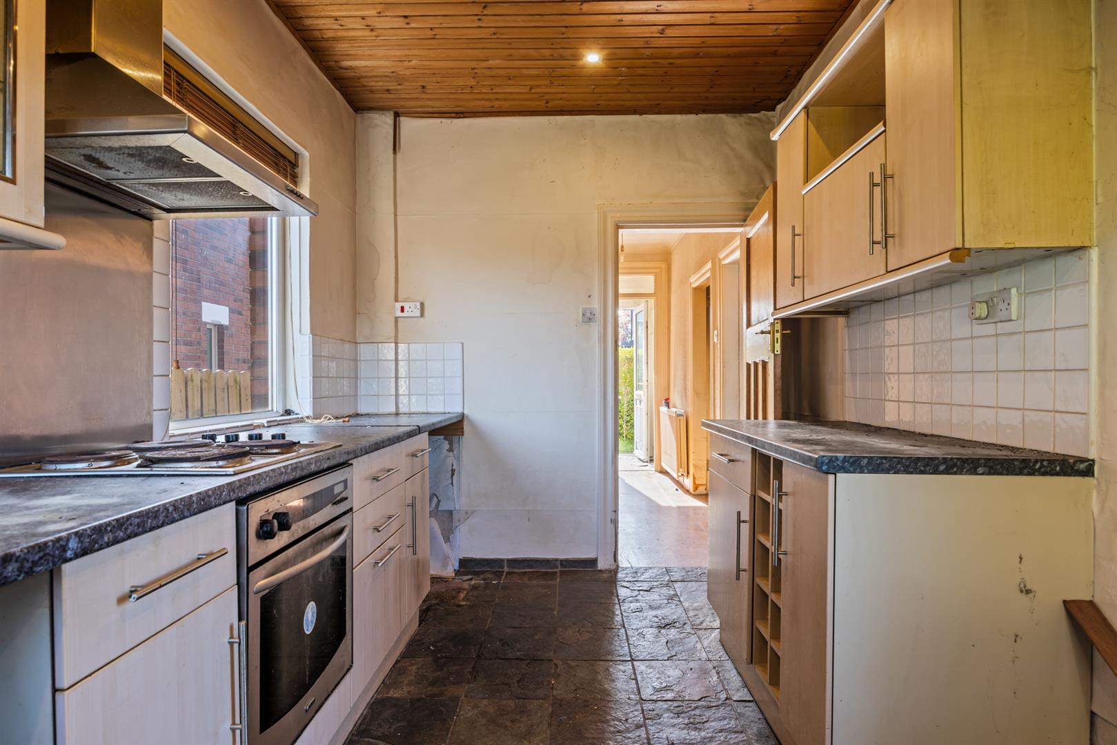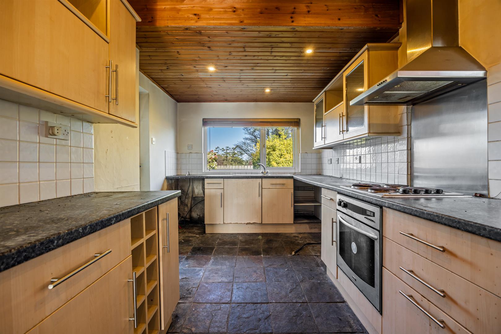 Range of high and low level units, single drainer stainless steel unit. Stainless steel oven with four ring gas hob, plumbed for washing machine, part tiled walls, fully tiled flooring.