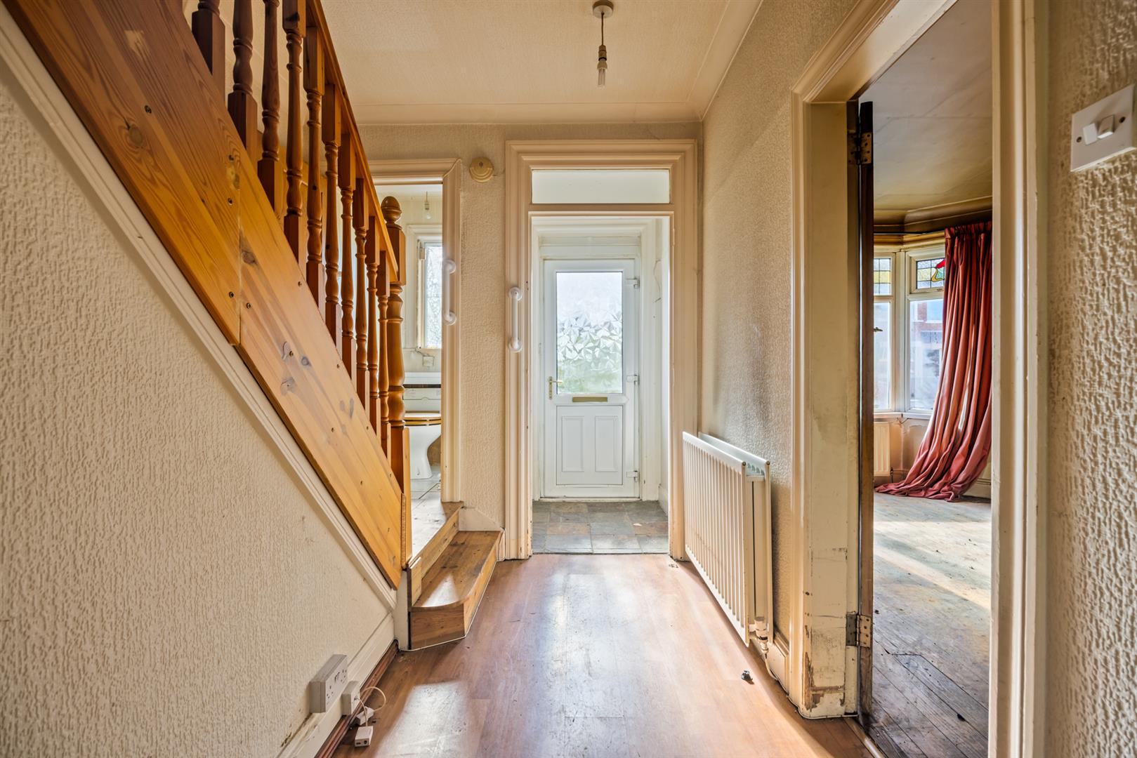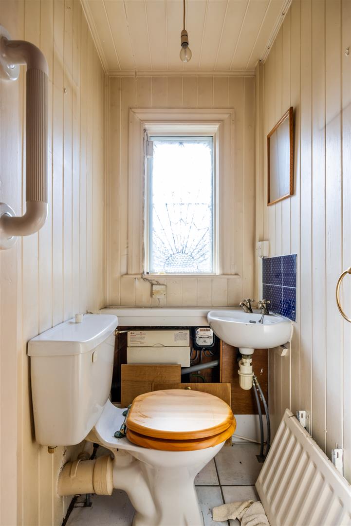 Laminate wooden flooring, storage under stairs and cloak room with low flush WC and wash hand basin.