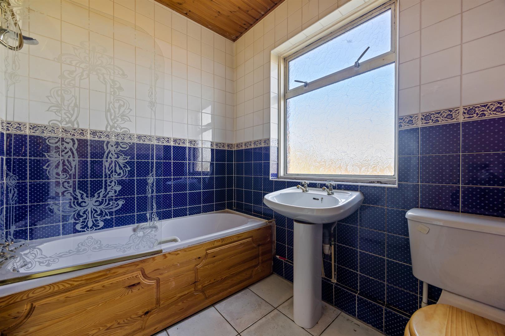 White suite comprising: Panelled bath with electric shower over, pedestal wash hand basin, low flush WC, fully tiled walls, fully tiled flooring.