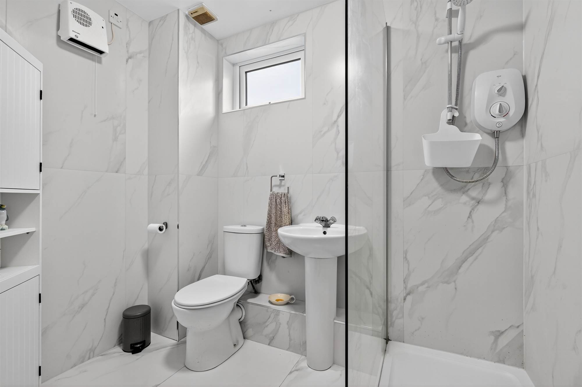 Fully tiled with walk-in shower enclosure and screen, Mira "Go" electric shower. Low flush wc, pedestal wash hand basin. Built-in bathroom cabinet storage.
